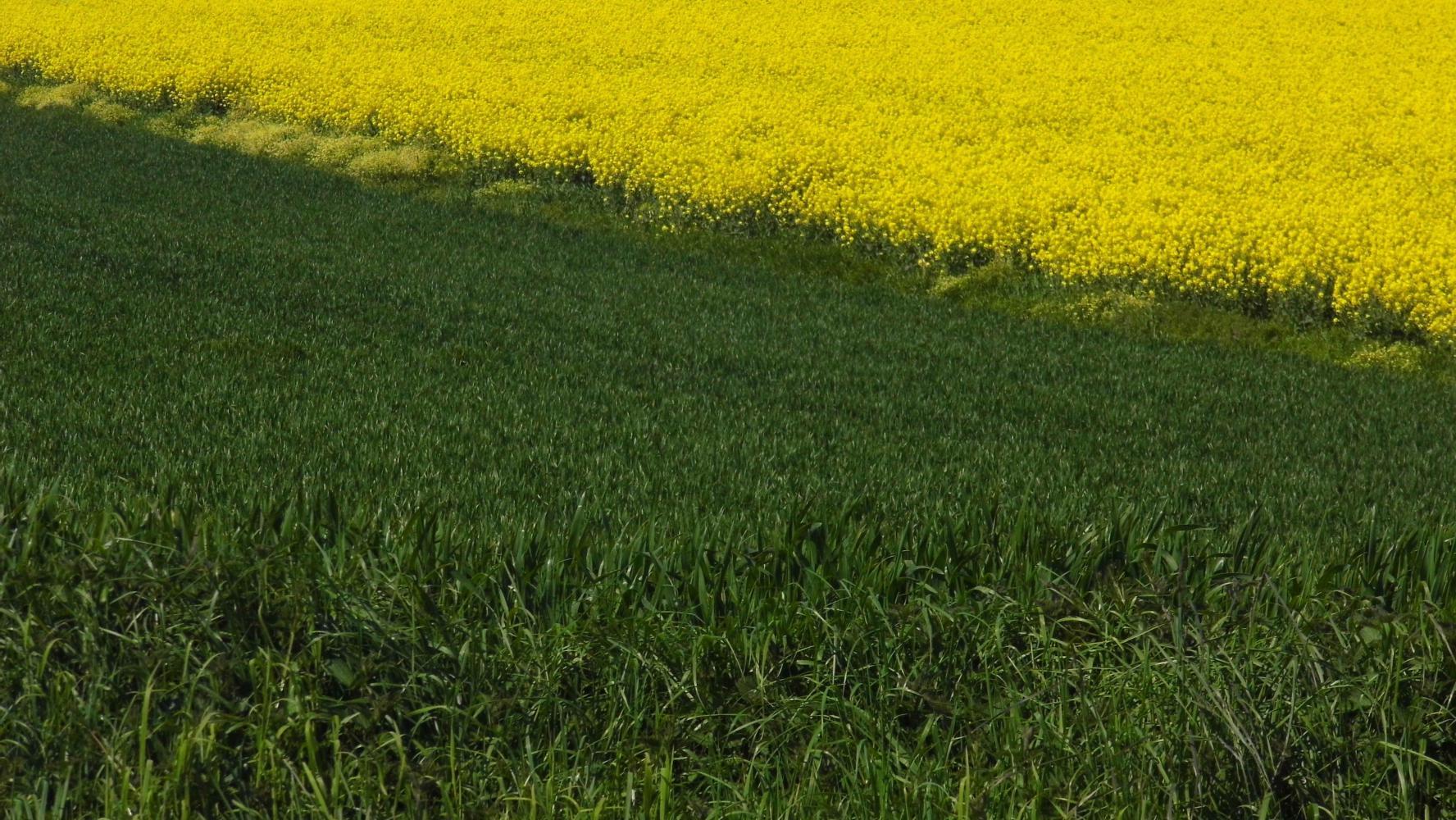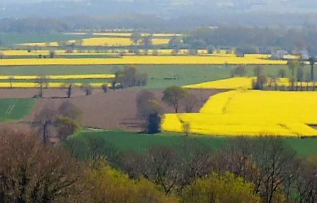 The road onward follows parallel to the motorway east, though almost a kilometre apart, well away from the constant din and only visible occasionally as a line with trucks moving along in slow-motion on the opposite hillside. My road climbs high until looking ahead over a patch-work of bright yellow, vivid green and brown farmland.