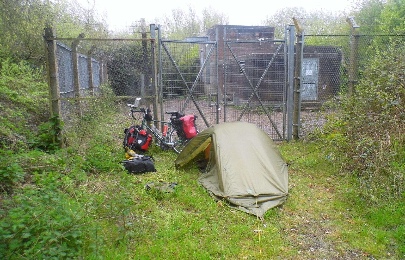 Riding further in the gravel drive, I get off to push as the street-lights dim, not wanting to crash into anything in the darkness. The drive leads to a pole-barrier blocking further access, so I wheel the bike round the side of the barrier. The track onwards is overgrown with just a narrow walking trail remaining along the middle with trees and undergrowth closing in on either side. It comes to an end at a wire-netting fence with padlocked gates; by which, is level and a big enough clearing for the tent, and is as well hidden as I could wish for. I use my head torch to shine light on the situation while pitching the tent, finding miraculously the tent rises to its normal height, after the morning's lack of room to sit upright when inside.