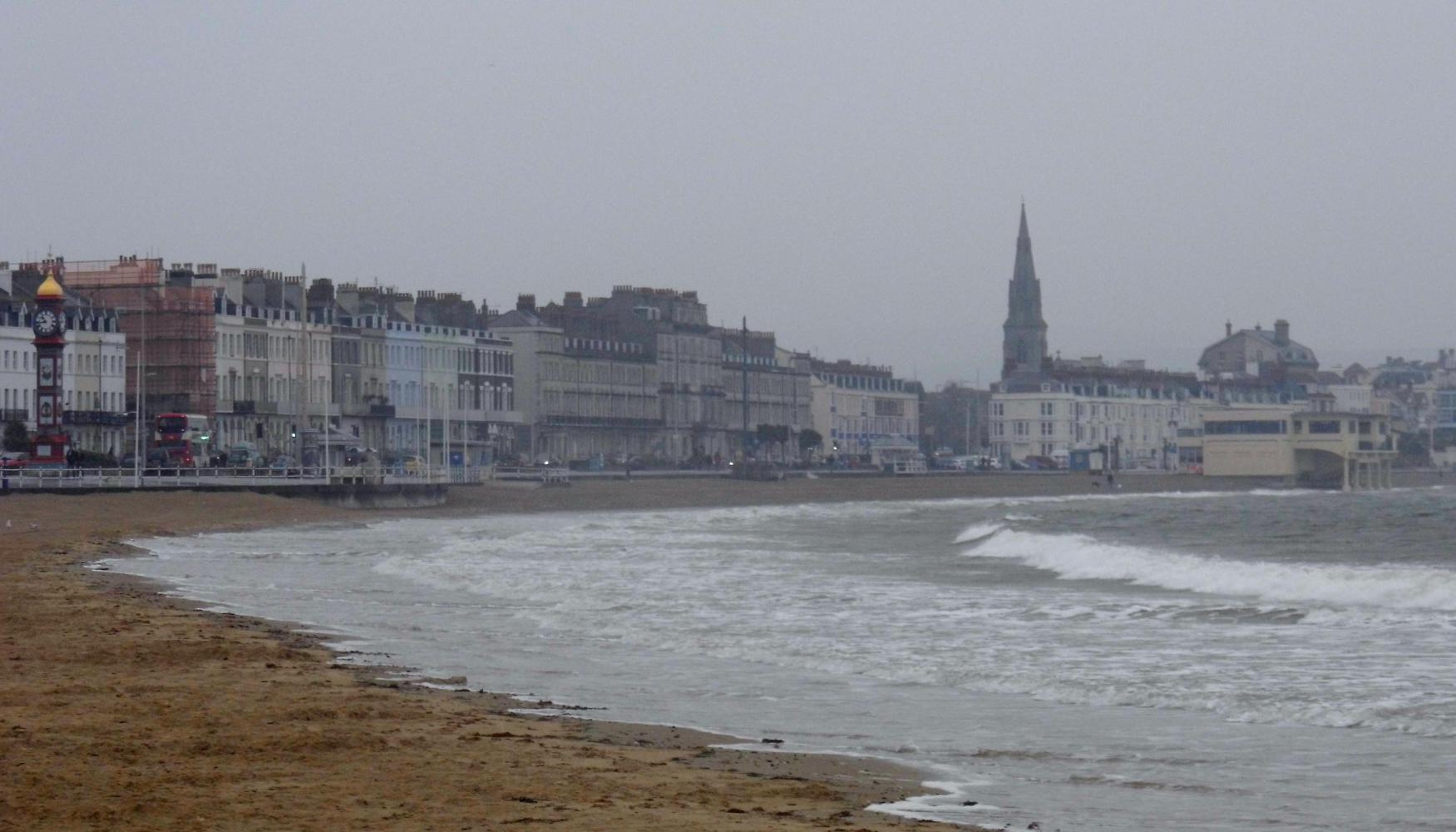 I ride on in the rain towards Weymouth, thinking it'll only be a shower, which will soon be over, but there's no let up; if anything, it becomes heavier. I pass through many roundabouts, veering left for Weymouth. The road straight on is to Dorchester. Then I'm on a busy divided highway, riding with the spray from passing cars and the grey gloom. I thought it wouldn't have taken so long, but the road goes on and on and I don't see any sign for Weymouth town-centre yet.