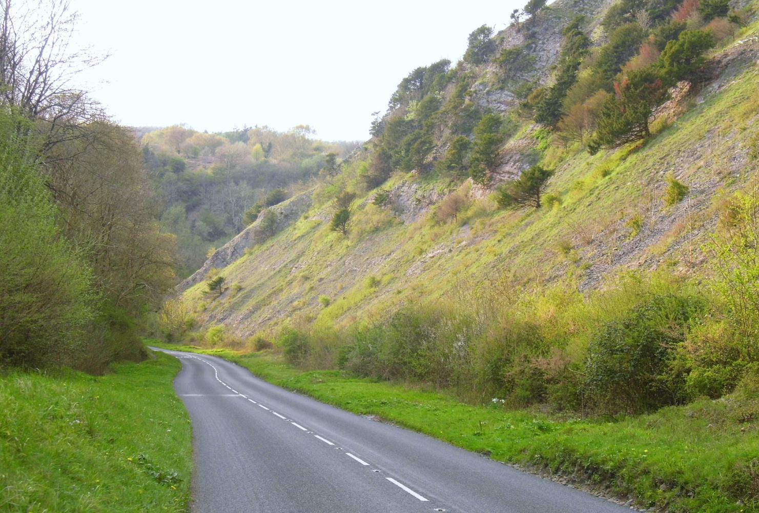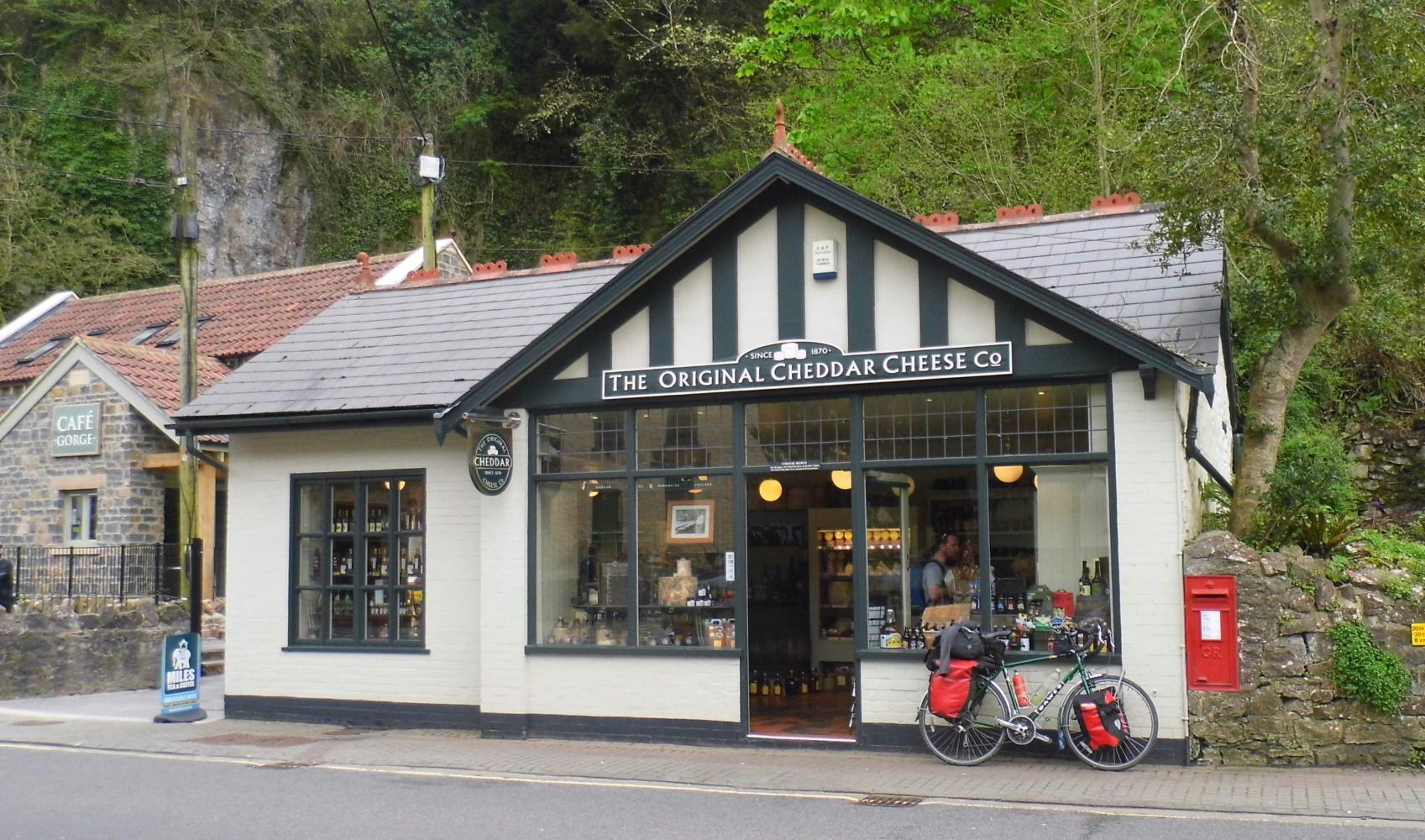 I leave him speaking on the phone, explaining to his wife why he's late and ride on towards Cheddar through a valley with a formidable barrage of hills to the right. I can see that the hills are where my road is headed by way of the famous Cheddar Gorge. The village is small, but then at the narrow opening into the hillside, The Gorge, there are souvenir shops, an original Cheddar Cheese shop and even a Costa Coffee; together with lots of overseas visitors, seemingly it is a big tourist attraction. And there's also lots of cyclists judging by the number of riders that sway their bikes from side-to-side, standing out-of-the-saddle riding pass, as I tackle the steep climb up through the ravine.