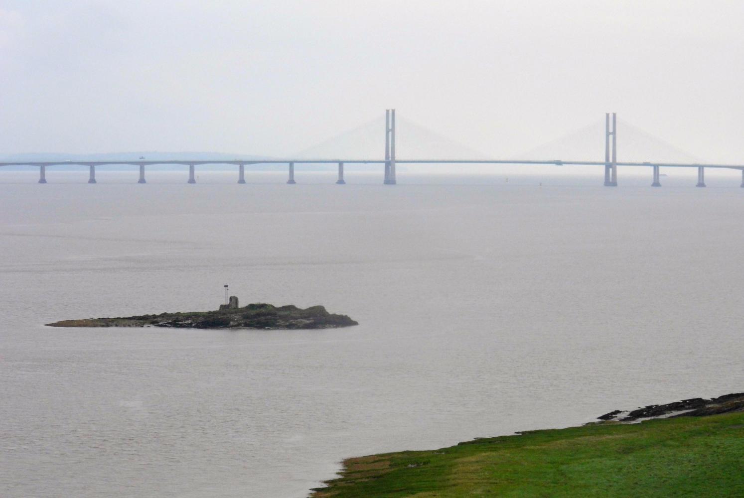 North of the river Avon, I'm almost on familiar ground as I passed this way a few years back. Soon I see the new Severn bridge across the desolate milky brown estuary. And later I feel a chilling wind on the long ride along the fenced off cycle-path over the old bridge, a mile or so to the north. Here I feel spots of rain. The rain doesn't amount to mush, and the sky brightens as I pass up through Chepstow; after which, I stop for a three o'clock lunch sitting on a tree stump in a recently felled grove of trees, with a view over the race course.