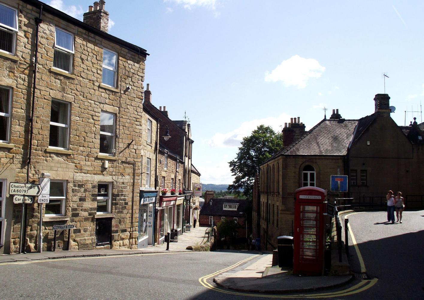 The river below on the right was enclosed by mature well rounded broad-leaf trees, Sycamore and Ash in full Summer leaf, which were also in hedgerows and as solitary trees in riverbank meadow and in yellow striped-round-baled hay fields rolling up to the road. I came down into Allendale village whose terrace of brown stone houses were all on the left, whereas the right of the village street had a low wall terrace making up the drop into the valley, along which were a few benches for pensioners to sit, like the oldies that have escaped their women-folk in the TV comedy "Last of the Summer Wine" to take in the view across the valley at the steep patchwork of fields and sparse hilltop opposite.