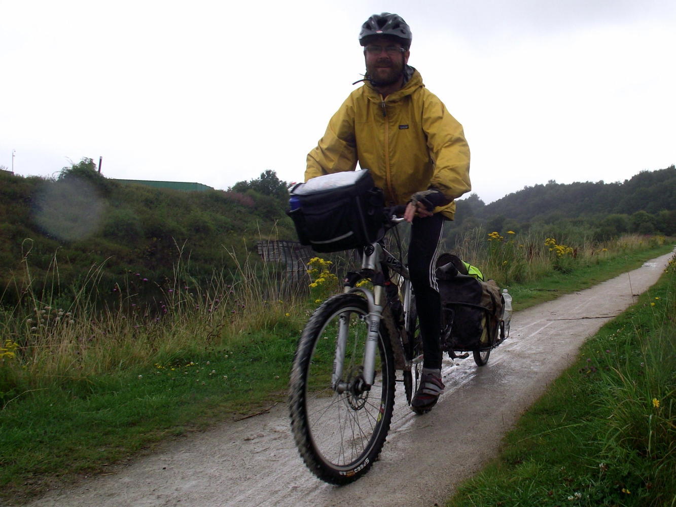 It began drizzling rain, falling horizontally for something like half an hour. The rain eased off then and it brightened up with sun breaking through, and I could see and smell fields of ripe barley reminding me that it was Summer after all. The reprieve though lasted all of ten minutes and it was soon drizzling light horizontal rain again. It was then I saw the orange cape of another cyclist approaching. Another touring cyclist. He had two rear black Ortlieb panniers and no other baggage. I crossed over to meet the bike as it drew level. It was a joy to see another cyclist and his opening words reflected the emotion "It's nice to see someone like me"; said slow and deliberately in a Mancunian accent. He was a man about sixty and had a rough brown face which said he'd spent many years somewhere though not England with a lot of sunshine. He said he was cycling home to Manchester and that Cheshire is his favour country for cycling. He also told me about the Shropshire and Union canal where he'd camped last night and said that it continued into North Wales which maybe useful for me. We chatted more then bid each other farewell and rode our separate ways.