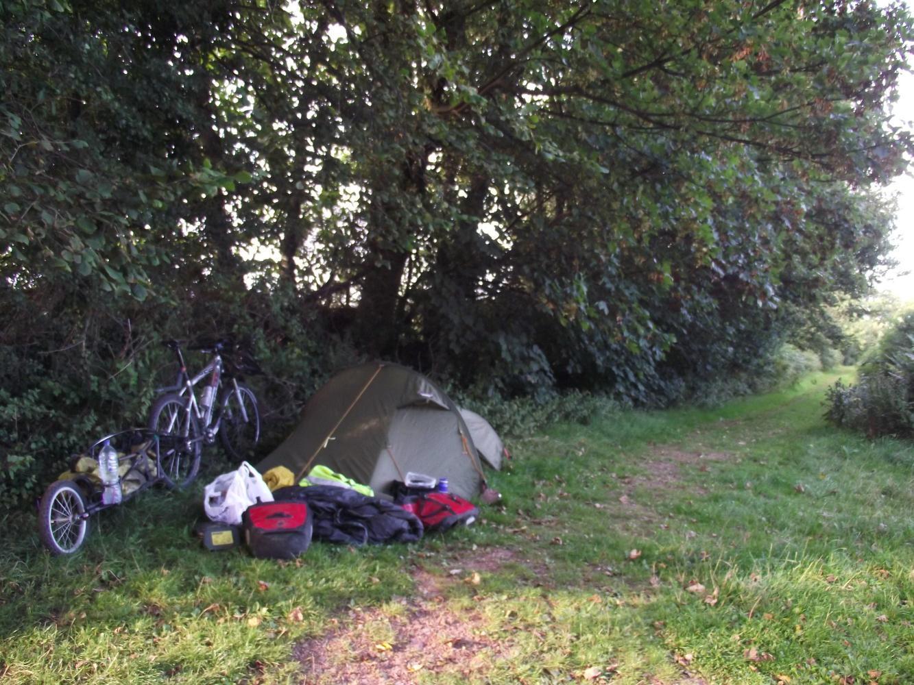 Back on the road and looking ahead I saw wooded hills. I would at last find a free campsite. I cycled off the main road uphill, a narrow little used road along the farmland-edge of woodland sloping up the hillside, and then turned up a narrower grassy right-of-way laneway with high leafy hedgerows either side. I'd to get off and push the bike further uphill up to a hilltop where the lane widened at the confluence of two pathways. I got the tent out and soon had it up tight under the hedge on one side of the wide laneway, a little from a style into a field where the right-of-way path continued down the field to the bottom of the hill and the trail through the grass could be seen rising up across a steep grassy field opposite, thither to the wooded hilltop.