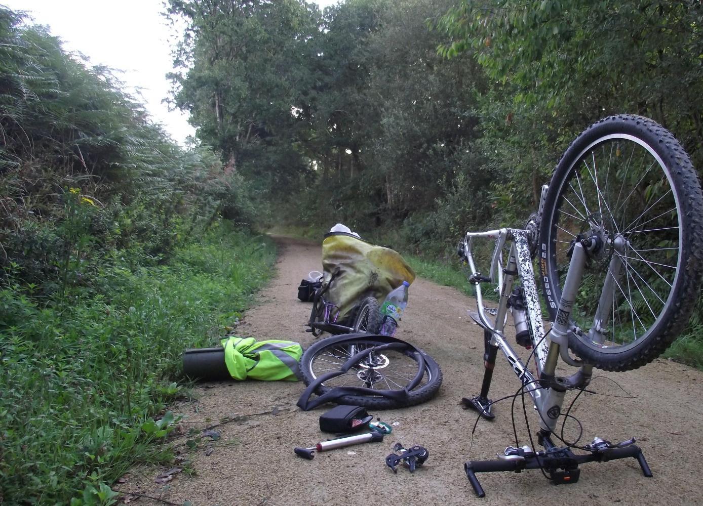 I rode on now with apprehension. Approaching noon just as I'd been riding for nearly two hours and was on the lookout for a place to stop for lunch, there came yet another sudden swish of air and whirling hiss, the rim quickly kissing the ground. With much trepidation, I said to myself, why now, after lasting so long.