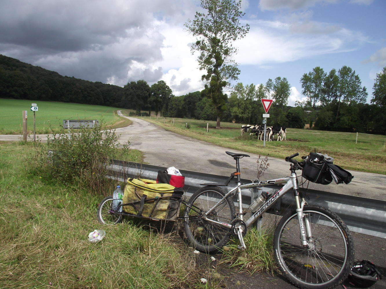 Cycling onwards, the path past underneath a autoroute and turning a corner came to a quiet crossroads with a wide plot of grass, the ideal place to picnic. I took out my lunch things and spread them out on the grass. Behind the fence across the road cattle some of them lying down looked on while chewing as I sat eating a pasta salad and then put it down as I had to take off the long-sleeved jersey Is wearing as I felt so warm and then, I saw dark cloud come in and block out the sun and so I'd to put the jersey back on again as I now felt cold. Moments later heavy drops of rain began to pelt me and I scrambled around gathering everything up putting them back in the bag as the cattle across the road rose from the ground and galloped off to the shelter of a tree.