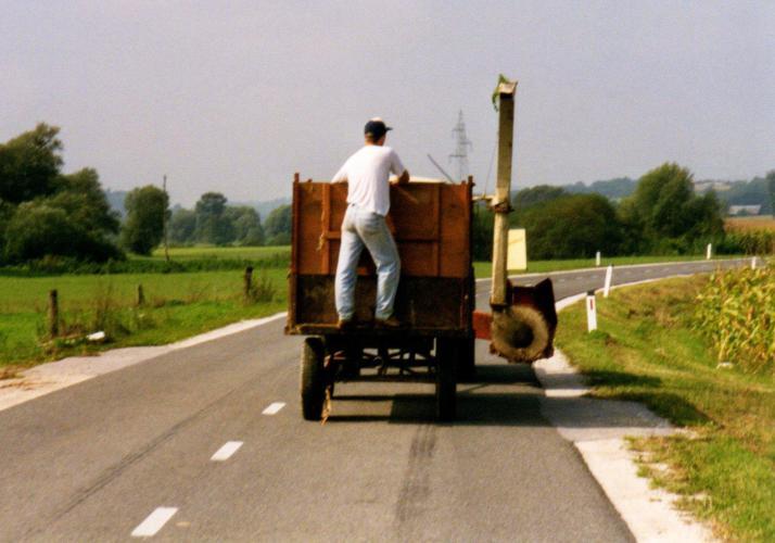 Most of this day was spent on very quiet roads in and around the hills south of the Drava. There were several memorable episodes. While stopping at the side of a store in a very small town, we were startled by greetings from a young man who was the wall. He was a cyclist nd had good English skills, nd was quite interesting to talk with. Later, in the very small town of Policane we encountered a group of five British cyclists, stopping to refuel at the same market as we had. The most gregarious of them, a short, rather ill at ease man, was riding a folding bike.