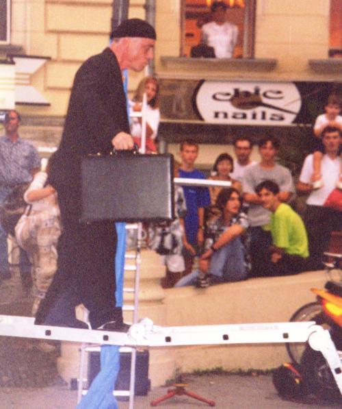 Celje was a bit of a disappointment, although it had some attractive features. The foremost attraction was a street theater performance in the main square. The acting troup was quite distinctive. An almost vaudvillian slapstick group, they presented a succession of vaguely connected skits. The group made extensive use of folding aluminum ladders as props, fashioning them into bridges, boats and so on; and of a long blue plastic tarp that was put to use as a river or barrier. The action frequently moved down the street and through the surrounding crowd, forcing the audience to hustle along after them almost as though they were participants.