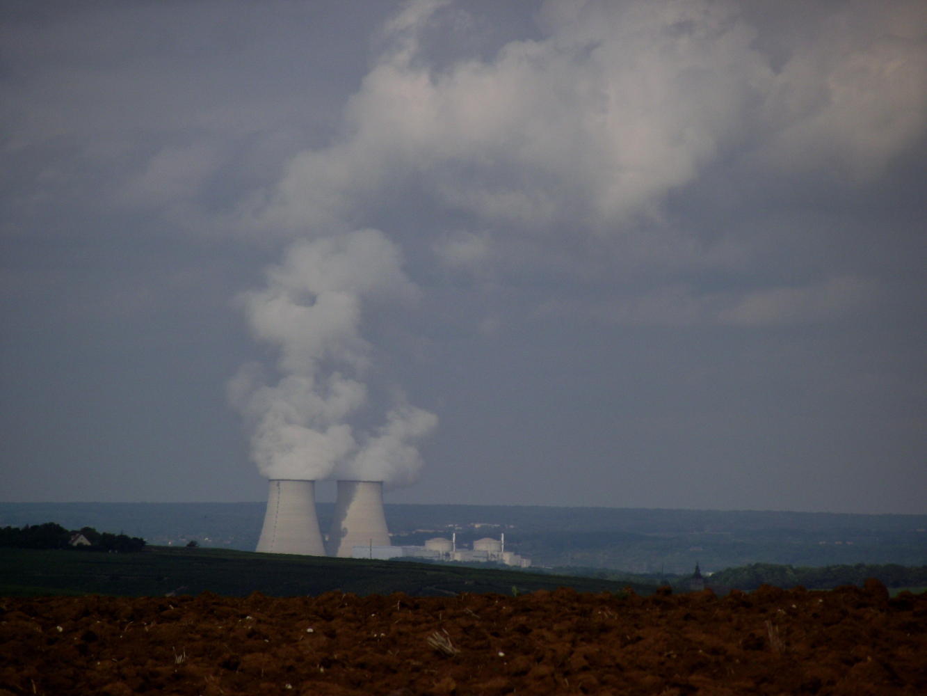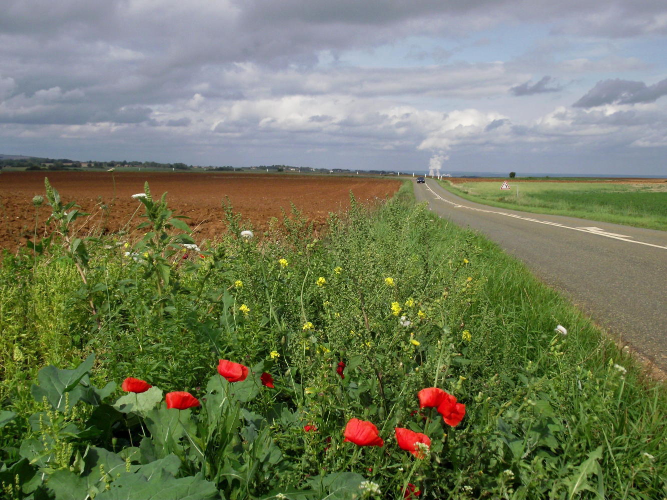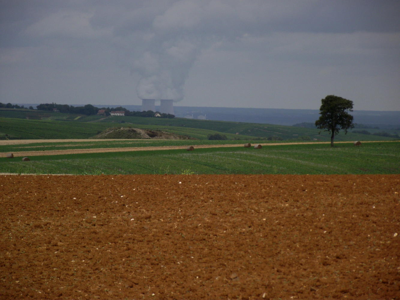 The road continued it's gentle up and down nature, curving around brown cultivated land and pasture where fawn coloured cows raised their heads to stare at me passing. I passed farmyards with old brick barns, where tractors attached to ploughs stood still in Sunday observance. There were nice old country houses, which had well tended vegetable gardens, with rows of leeks, carrots, beans, heads of green cabbage and big orange pumpkins. The road eventually surface out upon a treeless plateau with rough furrowed ploughed land and red poppies in the verge. The view opened wide across the Loire Valley here, to a distant grey horizon on the hills opposite. In the middle distance by the river, a nuclear power station was running flat out, funneling out two great columns of steam up to the clouds from it's fat imposing cooling towers.
