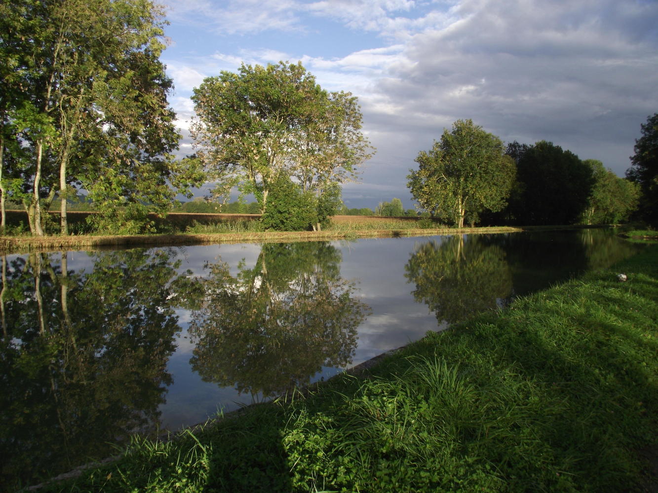 I had only gone a kilometre when I came to a wide grassy picnic area. Timely, as the beer had turned my legs to jelly even though I'd only drank a half litre. It was good to sit down and be cycling no more today. The intention was to eat, read and write in that order until dark, then put the tent up. Just then, a car turned off the road and approached slowly. It stopped across from me by the canal edge and an old man got out. He stood there looking into the canal in contemplation then came over and began talking at me. I did my best to follow. He by degrees slowed down and spoke a mix of French and broken English. I told him Is from Ireland and he told me he'd been on a fishing holiday in Ireland. "Beaucoup pub et dancers" he chuckled. He said that he has fished here for years, that the fish used to be big and plentiful, but not any more, they're all gone. They are no bigger than this, he indicated with outstretched hands with forefingers about eight inches apart. He then laid his head against upheld joined hands in imitation of sleep and bid me bonsoir.