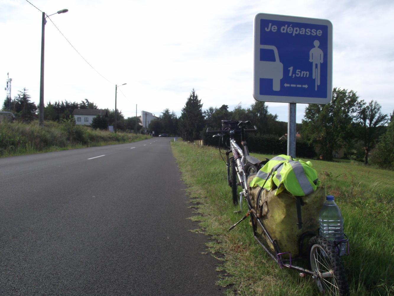 Cycling back around the square, I found the sought road, D108, and rode uphill pass a school and playground, public buildings and nice houses with gardens. At this point I saw another touring cyclist, descend toward me. Meeting, we nod amicably and nod intimating to swing around to meet. I halted and the cyclist swung around, u-turning across the road behind me, and came back up the road to my side. She was short with grey hair under a cycle-helmet and spoke first in French, then in English in a soft Dublin accent when I hesitantly responded. We exchanged names; her's, Merraid Foresythe. Merraid's bike was an old Dawes Galaxy: traveling light with only two rear panniers because she overnights in hostels; and last night told me, stayed in a place ran by Christian Brothers. It brought back memories of boarding school and a repressive catholic upbringing, she remarked with a certain irony. There is no plan, other than heading north to the Loire Valley and eventually, maybe to Brittany and catch a ferry back to Ireland, Merraid laughed and added, I've lots of time in anycase.