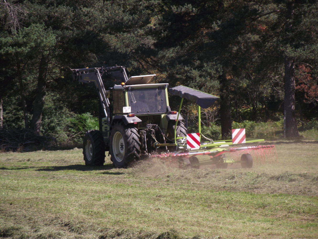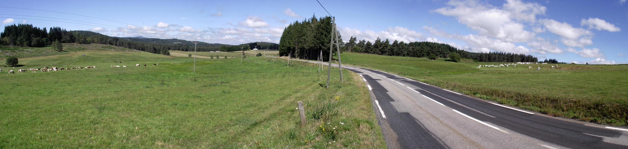 After some ten kilometres, I ground up to the hilltop town, Yssingeaux; and rode through narrow streets, passed houses with open shutters, bars, pavement chairs and tables with parasols, and stares from locals. Riding out of town the other side, I refilled my water bottles at a petrol station, riding on then, the road swooped downhill underneath a green road sign which read "Valence 105km";perhaps I'd reach there tomorrow, I thought, but now Is still looking for a place to camp. Is glad to see ahead though, amid bands of pastureland and plots with rows of tall maize, a block of woodland.