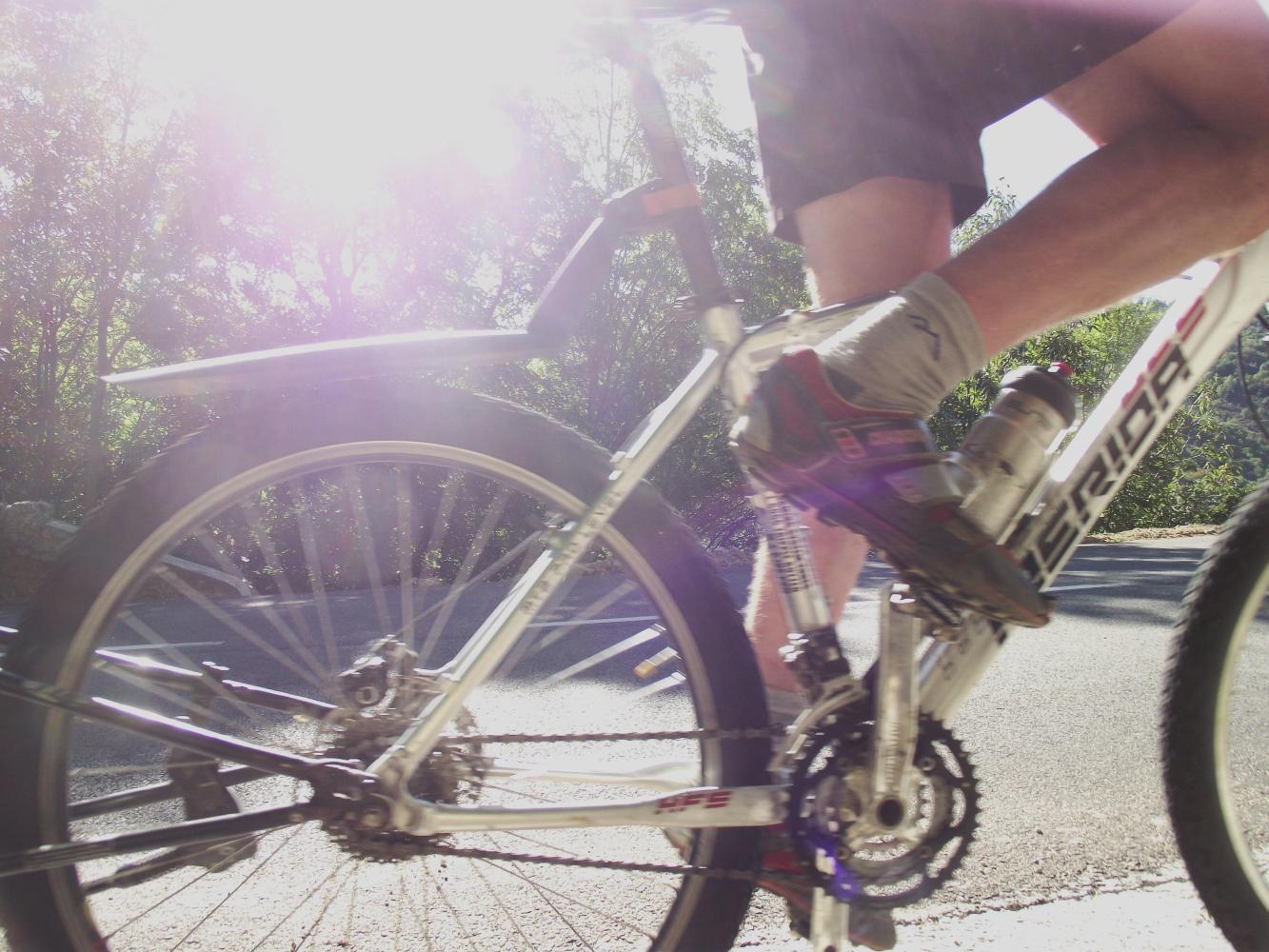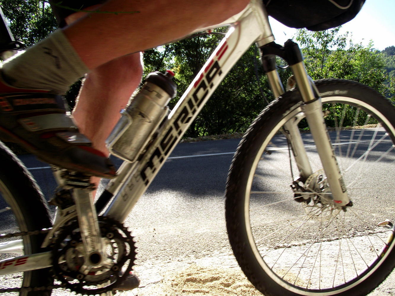 The occasional green cycle route sign pointed ahead; the road was slightly uphill, cut across a near vertical wooded slope facing a wall of patchy wooded hills opposite. The road got steeper though with nowhere for the road to go at last but up; thereupon at the first steep straight, was a large green board sign for cyclists, whereon was a green pyramid representing the hill with a little cyclist going up it; and numbers, indicating the gradient, the altitude and the number of kilometres to the top. It was eleven kilometres, from an altitude of 640m to 1119m; I thought this longish climb would be a good test for the single-speed gear, but as the gradient wasn't greater than six per cent which is hardly anything, I could turn the gear with ease, and also I stopped awhile to take photos of myself riding uphill, making it look hard. The board signs continued at every kilometre, counting down the kilometres left to the top, and a kind of an aid at pacing myself.