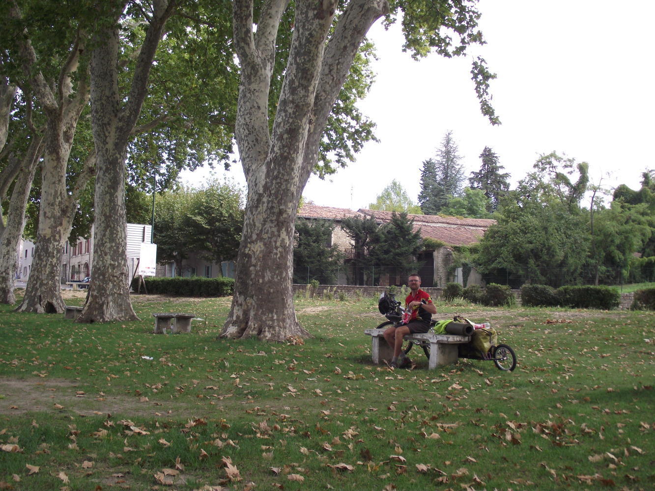 Cycling on, I avoided the busy town centre and turned toward Aubenes, where, I saw another cycle-tourer on the road ahead in bright yellow. I thought, a small stumpy rider until at a roundabout, where swinging sideways, I saw that the pedals where up at the front. It was a recumbent Is looking at.