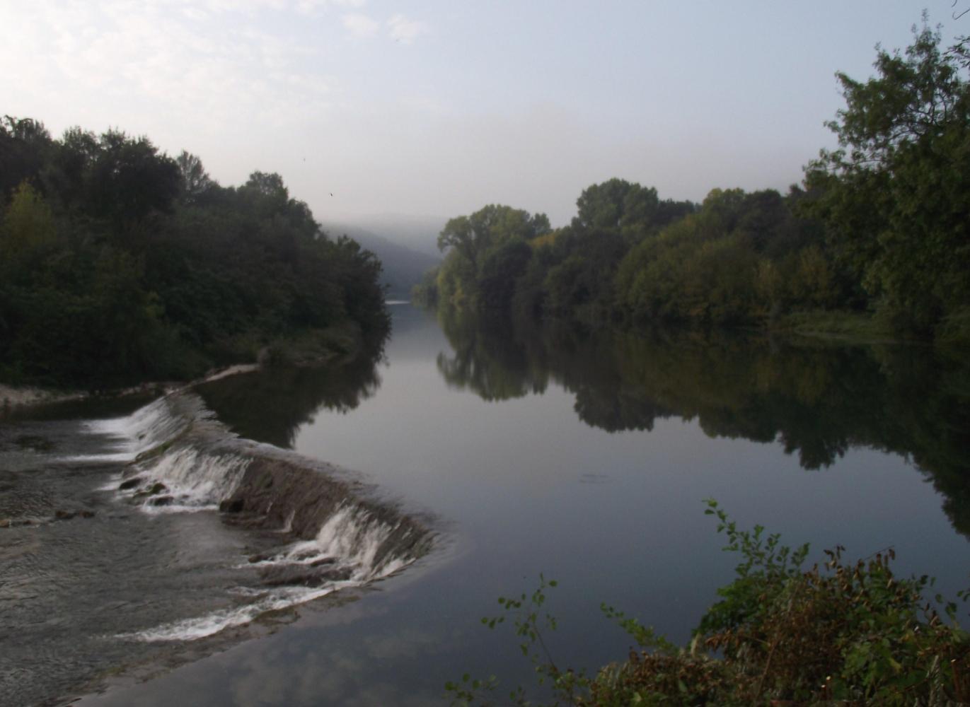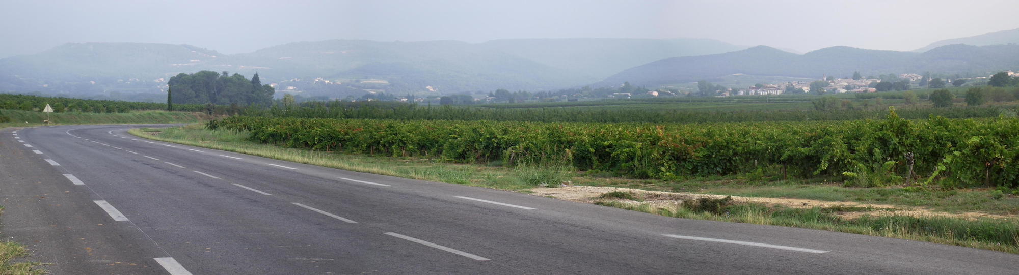I woke much earlier this morning and for the third morning breakfast was cake and water. It was a misty morning, but it wasn't such a problem on the road as I could see far enough ahead. I worried though, what with only a rear-brake, because the way ahead dropped dramatically down through a gorge, but the gradient remained ever so gradual and before long anyway, the road leveled out in a wide river valley. The mist was retreating and the sun shone through, and either side of the road had row upon row of wine grapes running off at right angles to the hills.