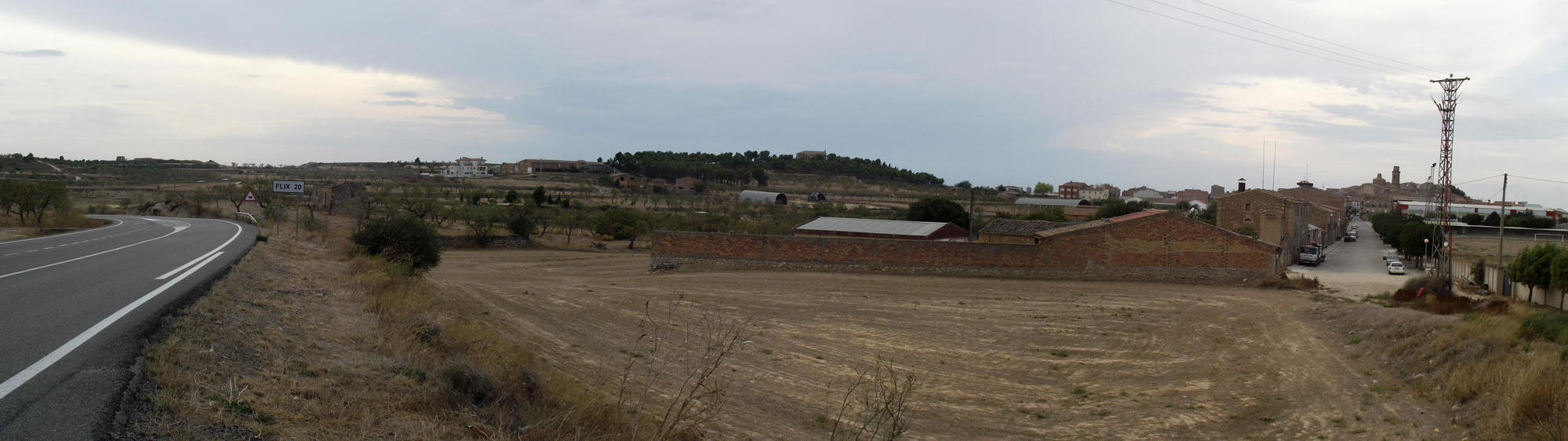 A kilometre further and I was cycling over a long bridge over the Rio Erbo, where I saw the endless pipelines in all directions and jetties of a chemical plant upstream on the opposite riverbank, and following the river around, I found the road for a town called Arce, shown on the map where a green outlined road, a supposedly scenic route began, and a likely good place to camp as it was now after seven. Arce was only four kilometres more along the river and joined up to Flix by industrial sprawl including the power station seen earlier on the opposite riverbank. The scenic route climbed out of town above the river valley, and as the road had recently been rebuilt, there were lots of sections of old road which passed outside the crash-barrier and around the outside of new cuttings, in which, I soon found a place to camp, hidden from the road and looking back along the valley, the way I'd come.