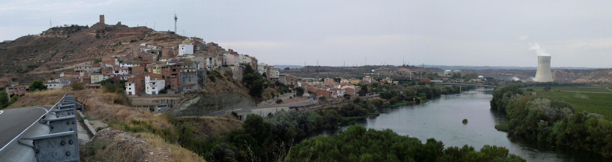 It remained dull and murky towards evening when the road descended a long way down to a greener countryside, toward the town of Flix on Rio Erbo, where on rounding a bend, Is stroke by the sight of an impressive column of steam rising to the sky from a fat concrete pipe like cooling tower above the treetops ahead, but which disappeared from sight again on dropping further downhill through a deep cutting.