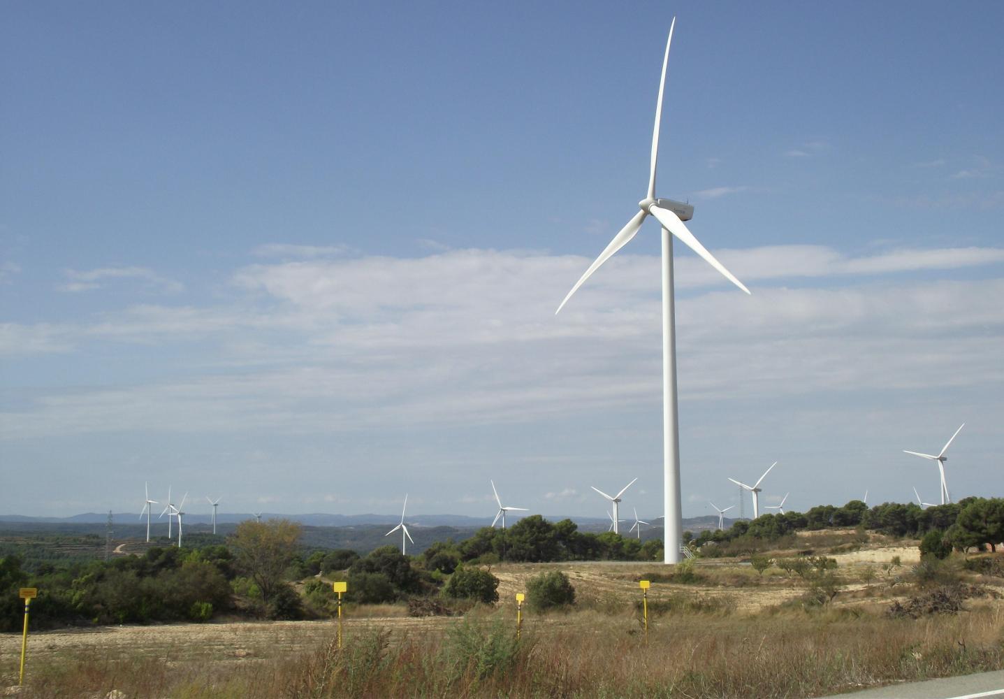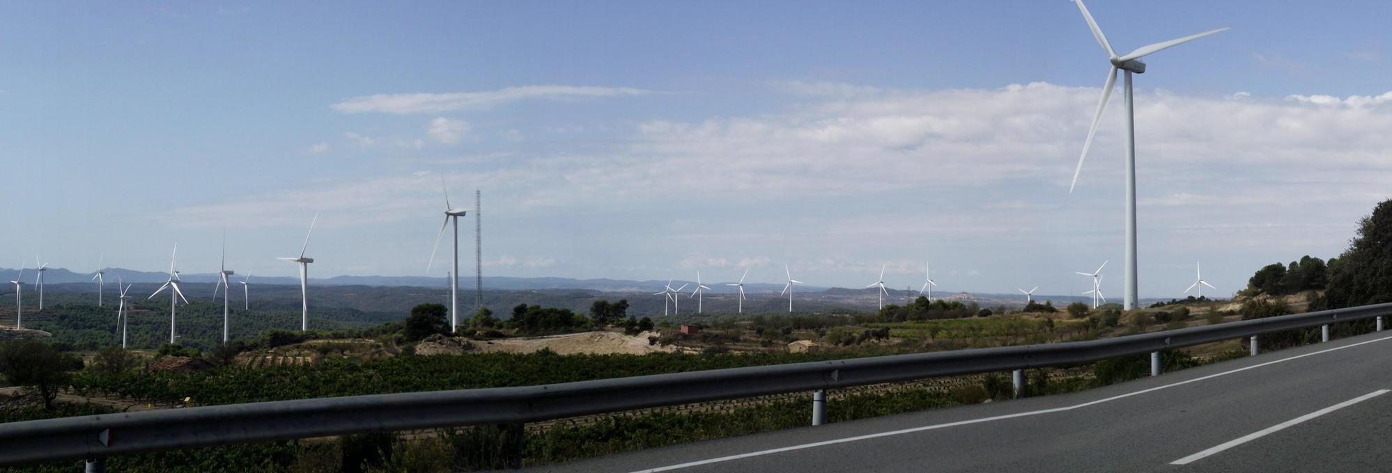 Riding away and onwards, the sun first made an appearance at eleven thirty-ish with sudden shadows cast from roadside crash barrier and dwarf pines as the road gradually ascended up towards a line of hilltop wind turbines. And by noon, the cloud had all but cleared and it had warmed up significantly, while the road had reached a high plateau with a view long and far to a blue horizon. Lots more wind turbines lined the heights; the propeller blades lazily turning upon tall white props on those up close.