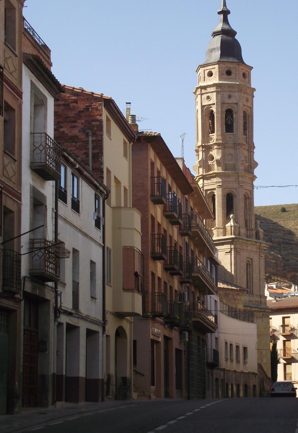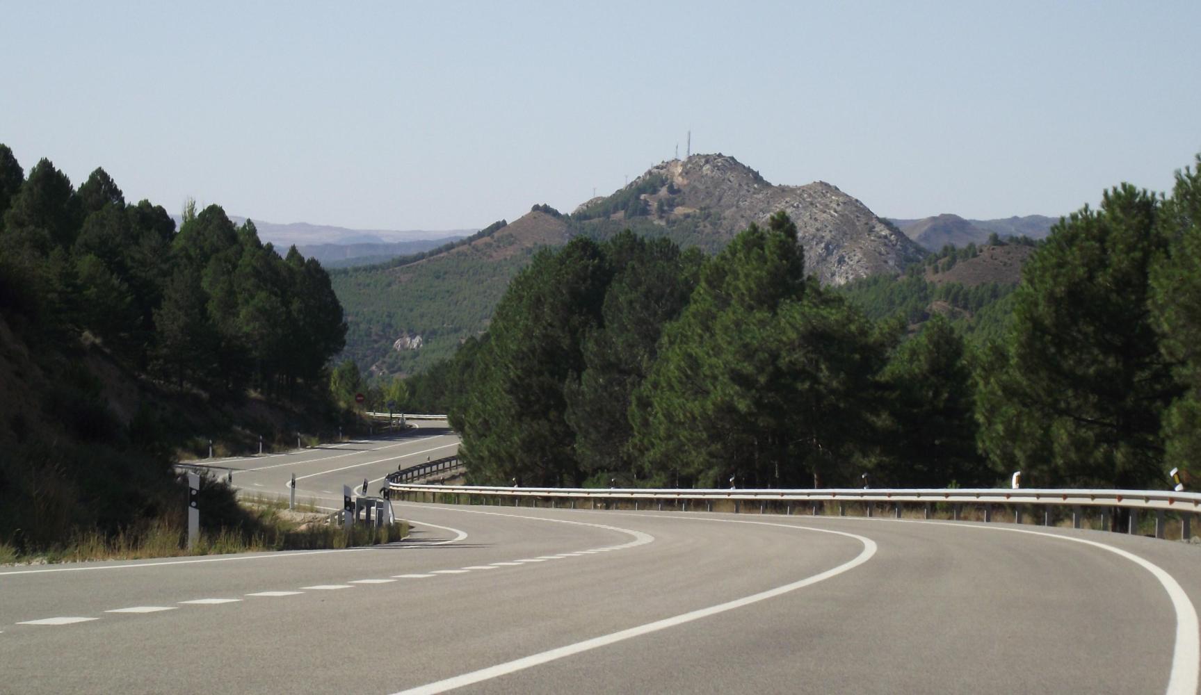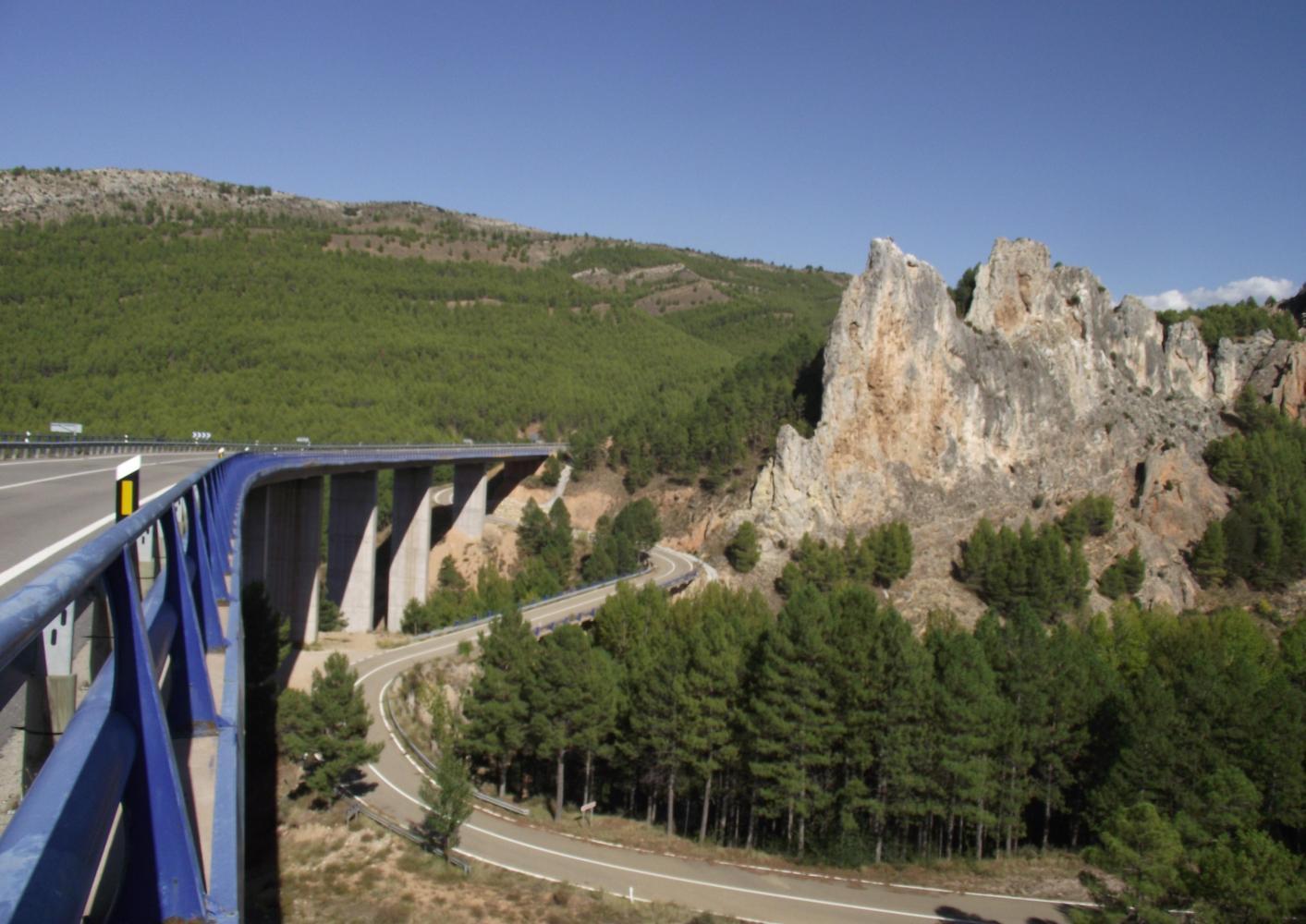 Eventually, the road made a sweeping switch-back descend towards the rooftops and church bell-tower of Montabon at the head of a cultivated valley. Not a soul was abroad, nor were there any cars on the narrow street when I past through. And it was another five kilometres on lifeless straight road past maize fields to a big roundabout where the route split. Straight on went to Madrid, but I cycled round past and rode left toward the valley's high enclosing slopes where before long the road crossed Rio Martin and then followed the river up a narrow gorge.