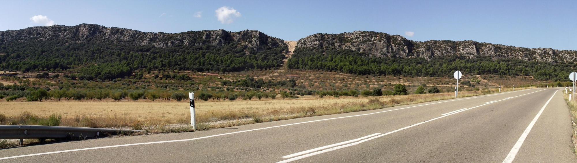 Safely hidden from the gaze of the road behind the heap of chicken manure, I was feeling lucky that I'd found my campsite, as there wasn't much potential wild-camping for quite a long way. After fourteen kilometres I cycled through the village of Calanda, then the road followed across scrubland edged by flat tabular hills; and further on, climbed up to and through a gap in a rocky escarpment, dropping down the other side into a valley as arid as what preceded it.