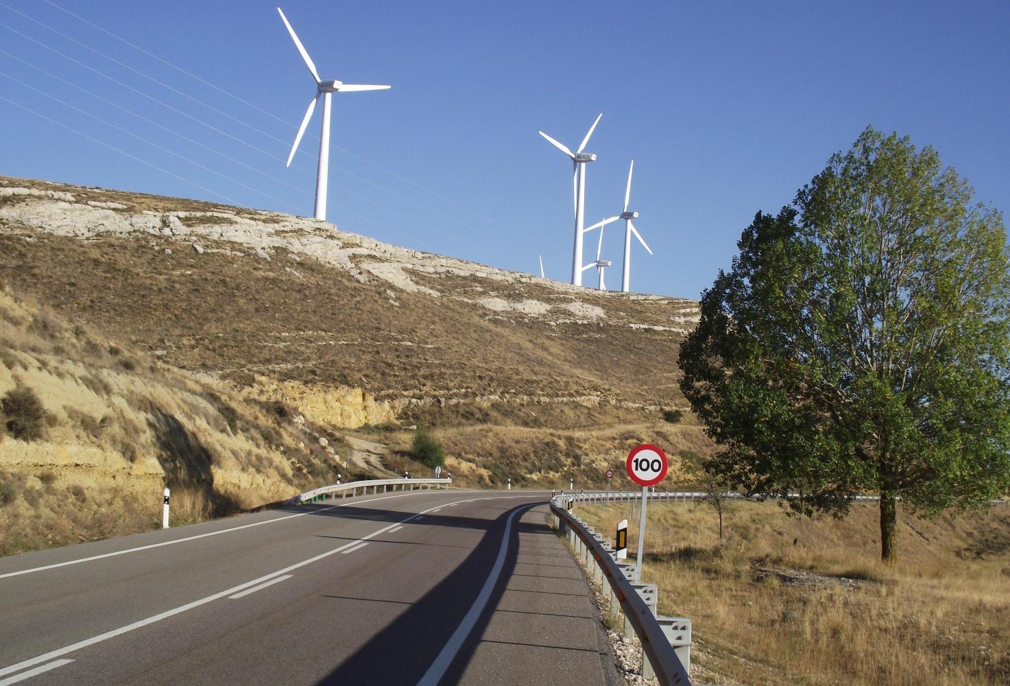 I didn't quite expect the hardship of the inevitable climb ahead. The sign by the roadside with the wedge showed seven per cent for six kilometres: not for me the most brutal of climbs. On the upwards slope away from the petrol station on the edge of town, I soon came to a sign with a black arrow pointed ahead and a branch split-off left: Barrio Industrial. The road that split-left, ran downhill across the valley to a black hill of spoil by a great, concrete, hulk with a chimney, standing tall and cylindrical with a wisp of white smoke drifting from the top in stark contrast to the wild sierra in the background. I went up past the mine on the left, with the line of wind turbines on the brow ahead, and the yellow line on the map, showed an elbow, but was more a long gradual curve around the slope on the right.