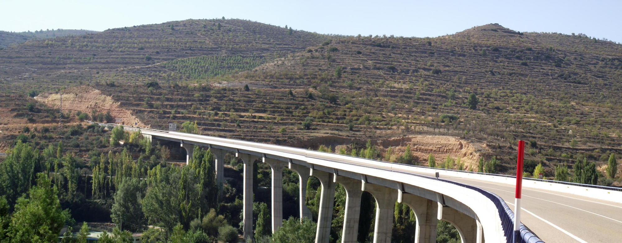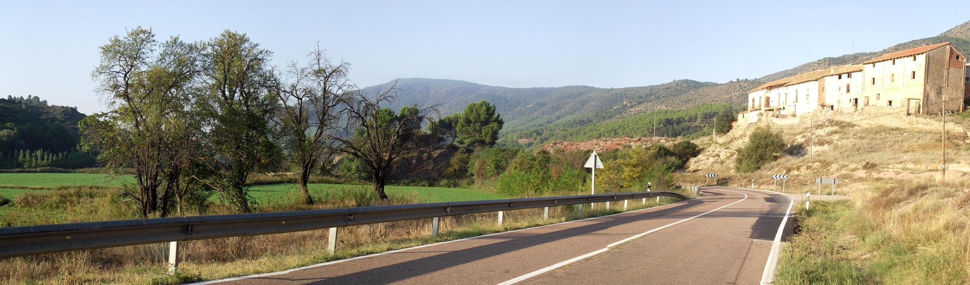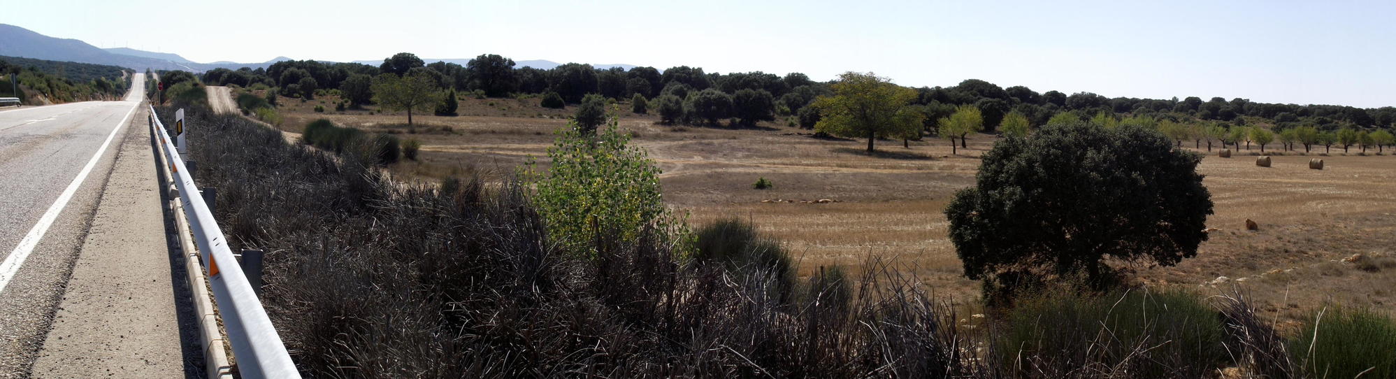 Leaving town, over the bridge and back up the steep hill to the road, had me at my limit without getting off to push. I was out of the saddle stomping down hard on the pedals to turn the thirty-two by twenty-one single-speed gear, but at lease it was short. Then immediately after joining the N320 at the top of the hill, the road that followed was elevated across the valley by a sleek new viaduct, thereby avoiding a big descend and a long ascend up again in the warm midday sun. As it were, there was a five kilometre climb when I'd got to the viaduct's opposite side which would've been much steeper if it hadn't of been for a deep cutting through the hill. When I eventually crested the hill, the itinerary ahead was arid upland plain unlike the greener valley hitherto. I cycled a long way past a mix of grey scrub-land and yellow stubble fields with an odd bare tree at the roadside, not enough to provide shade to lunch. I passed through two villages deserted at this time of day and kept going even though my stomach began to feel cramped from hunger and thirst.