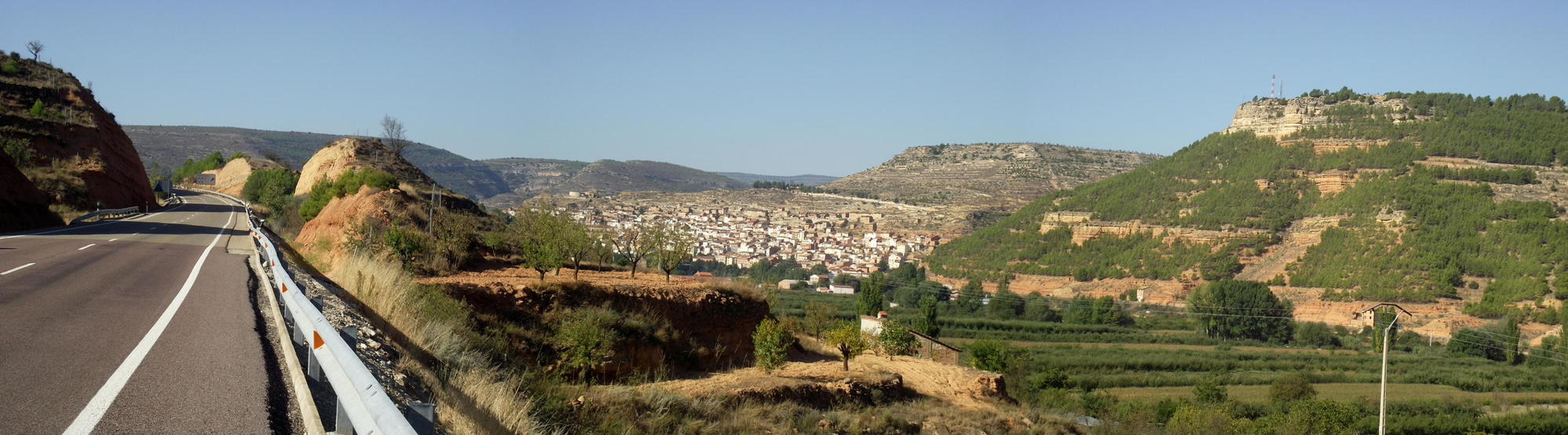 My custom now that I'm in Spain, is to ride in hope of reaching the next town with a supermercado shortly before noon. This morning to recap on my location, I started fifteen kilometres south of Teruel, and all morning I past leafy hedge-bound fields, in a valley enclosed by tabular hills dotted with dwarf pines on their scree slopes and often growing further up, in whichever rocky crevasse a tree had got a foothold. There wasn't a cloud in the sky so it was warming up and, I was still due south on N320.