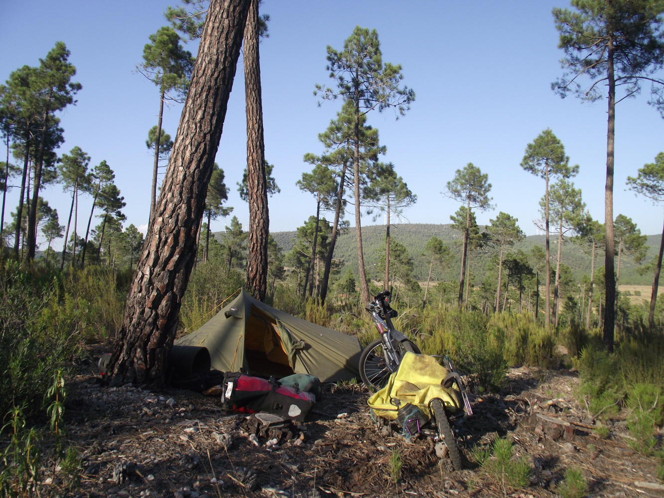 It was two o'clock when Is closing in on what was a blue ridge on the horizon earlier, but was a silver colour now below which, I could see pine clad hills and soon there were pine-plantations on either side where I at last stopped for lunch and afterwards, a bit further on found a place to camp.
