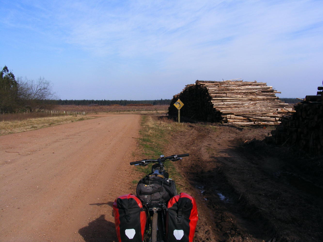 The logging trucks drove past my plantation round the clock, well they were rattling or labouring depending on whether loaded or returning empty when I slept at midnight and also when I awoke at six. I had wanted to be on the road at seven thirty but one of the ties holding the spare tires to the front rack had broke last thing last night so it took a little time extra putting that right and eventually I set off at eight.