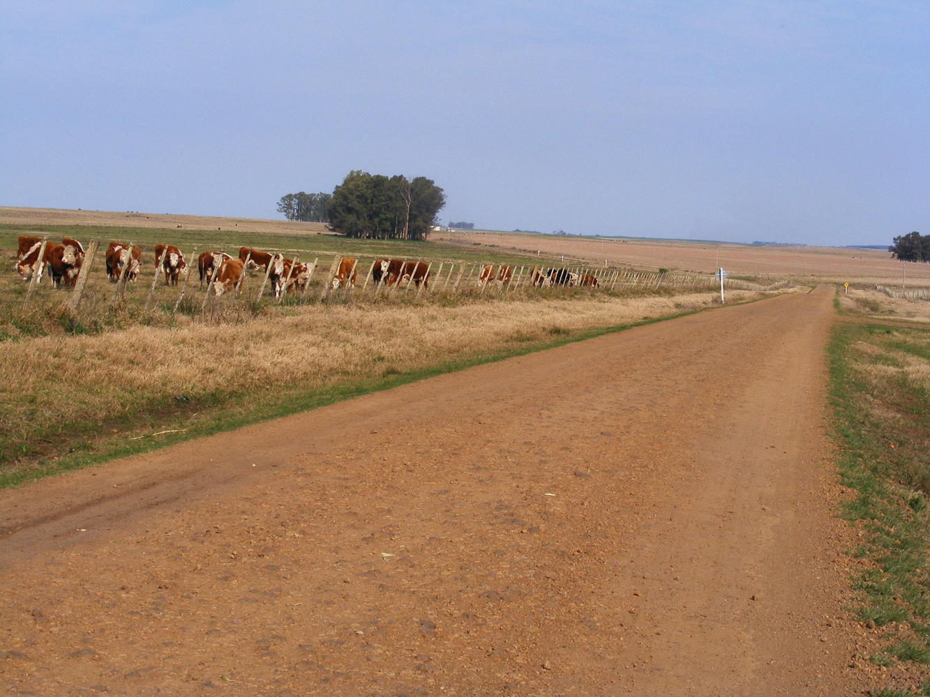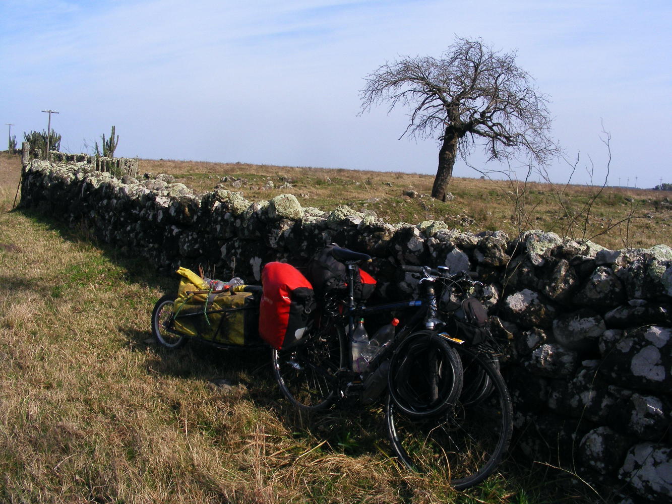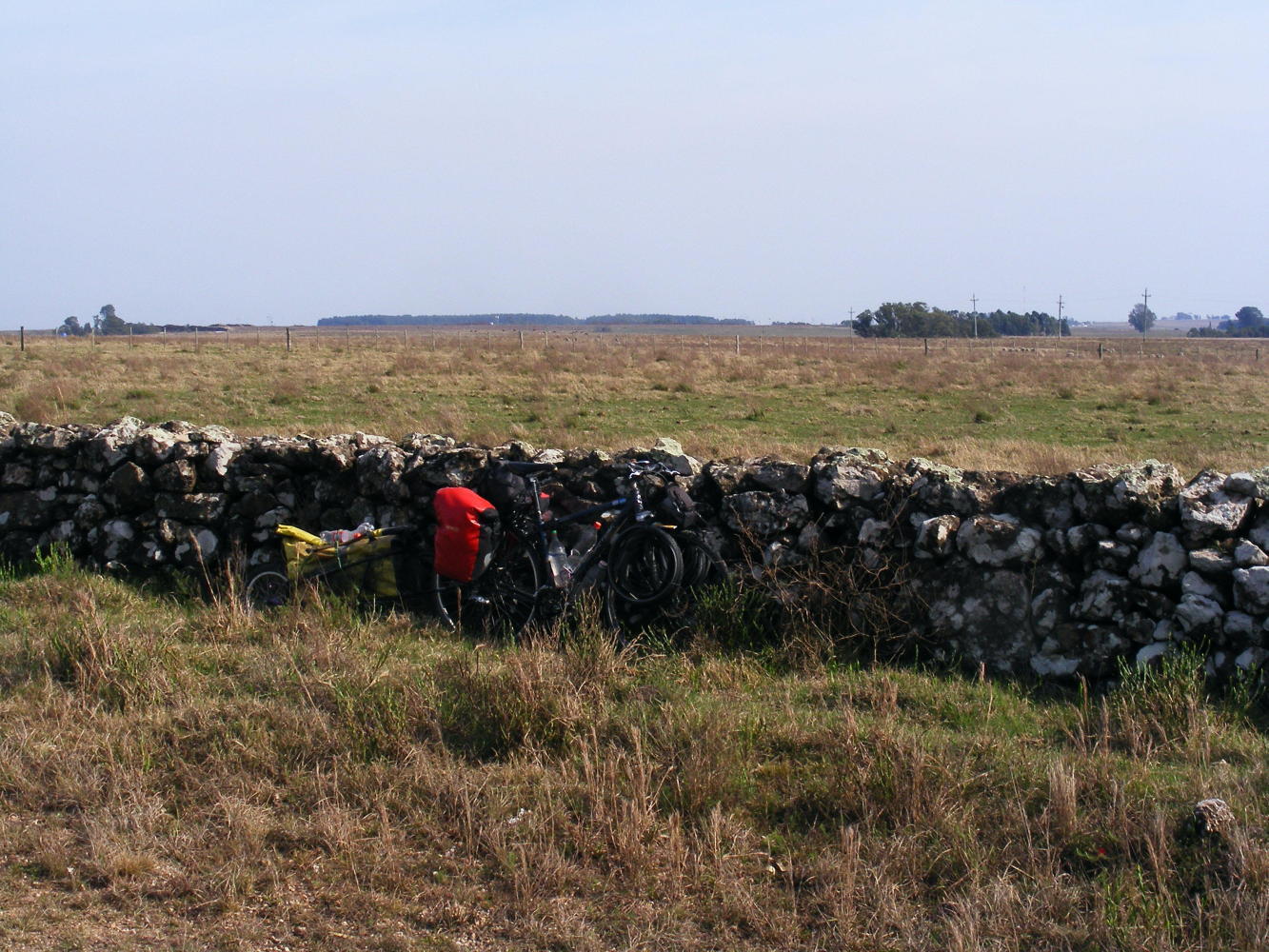 I entered the village across a railway level crossing and the normal dogs came greeting me but they were quite timid. The first shop I entered was a small place which didn't sell anything I needed. The next was a general store with some food but no bread or other essentials. The last had everything including saddles, riding boots and other gaucho paraphernalia. Outside all of the shops men young and old many of them wearing big black beres sat around chatting while drinking mate. It went silence a moment when I arrived but soon the chat resumed. At the last shop a little boy with blond hair and brown eyes said to his mother 'look a cyclist' and then began giggling. When I asked his name he just kept on giggling. It was the same two days before in Paysandu by a school two little girls thought I's very funny. I don't quite know why. I've not shaved for a while and I wear a funny hat but many people don't shave and wear funny hats. Is, it that I wear tights? That's probably it, with the combination of the others I perhaps look perfectly ridiculous to these kids.