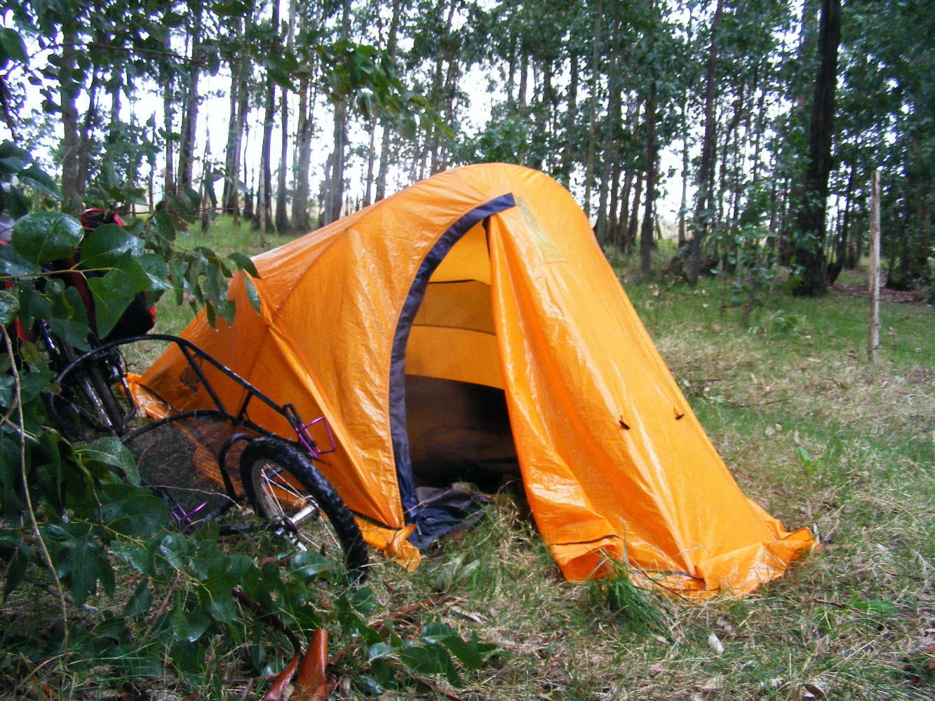 I cycled another 25km until the rain which had held off all day looked inevitable. A dry place to camp was urgently needed. I's in luck though as just ahead was a wood extended on the outside of the fence to the edge of the road. I got the tent up on a dry spot well shielded from the road just as it began to rain.