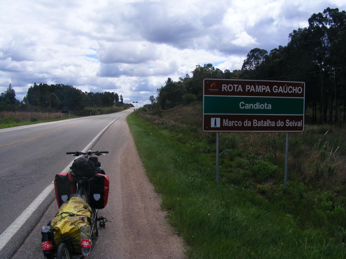 I've just arrived at he outskirts of a place called Pinhero Machado. I've checked the map and according to it it's another 80km to the town of Bage. There maybe places on the way with services, it's hard to say from a circle on a map what a place will have so I've decided not to risk it and instead buy what I need for the day here.