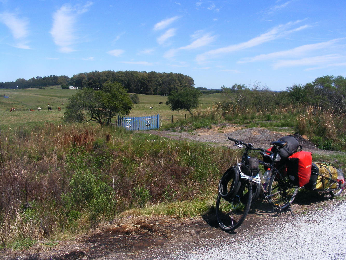 The countryside now is very like Uruguay, that dry seed grass rough pasture bordering on moorland in places. All isn't well though as on the horizon I see white plumes perhaps another cement factory or power station. I swoop down a hill with a bridge at the bottom. There's a police car at the other side parked on the shoulder. A policeman is out taking notes of what he's seen. He's seen me, puts his thumb up and smiles at me as I pass calling out 'oppah'. Is that hello or something? A portuguese fraze book is badly in need and is on my priority list.