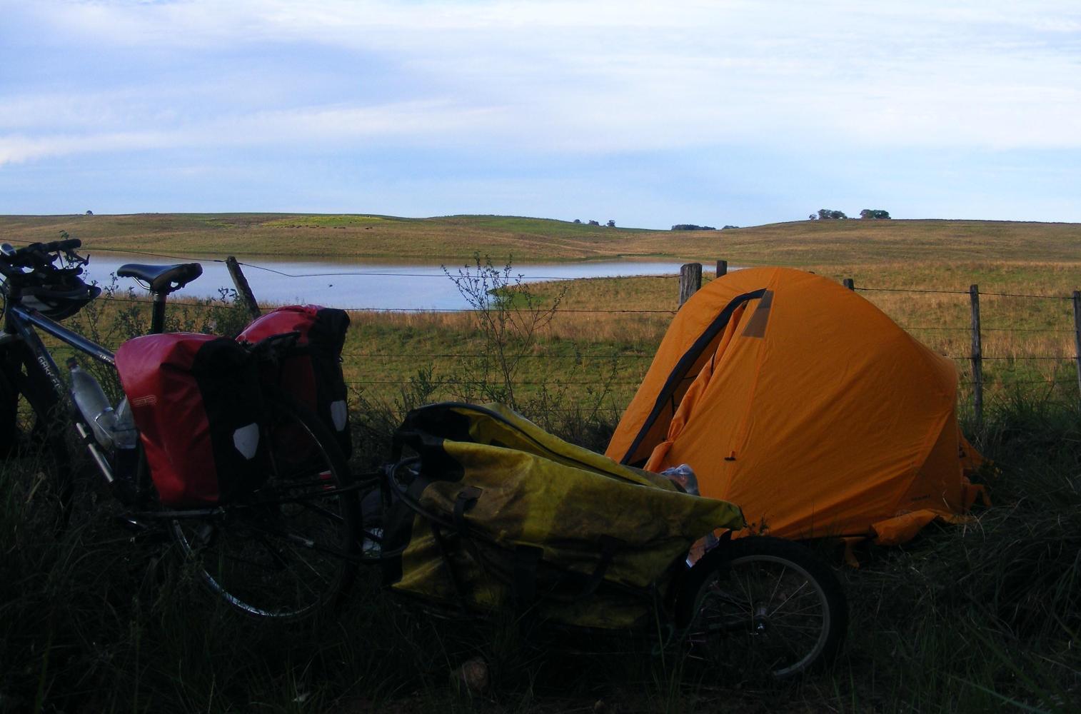 There were abundant wild camping possiblities when the time came. I'm now as I write camped in a roadside grove of gum trees hidden from the road by undergrowth. The veiw across the fence away from the road is rough pasture with a lake.