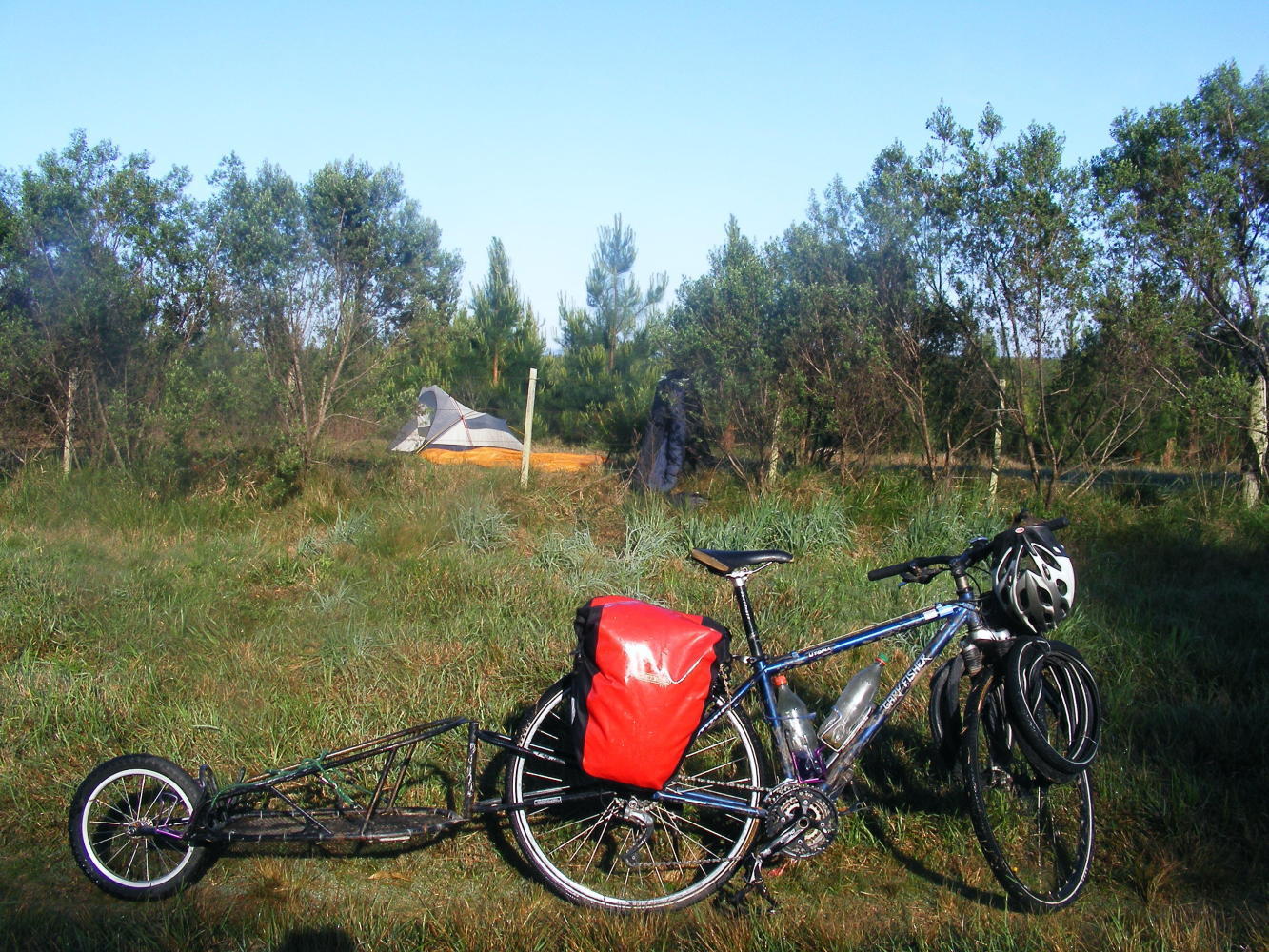 This morning was one of those dewy mornings were, grass, the leaves on the trees are dripping wet and the tent's fly sheet is soaked inside and out. And there wasn't much point in waiting for the sun to dry things out not if you like to be on the road early. Additionally there were tall trees blocking the sun so I had to pack the tent wet.
