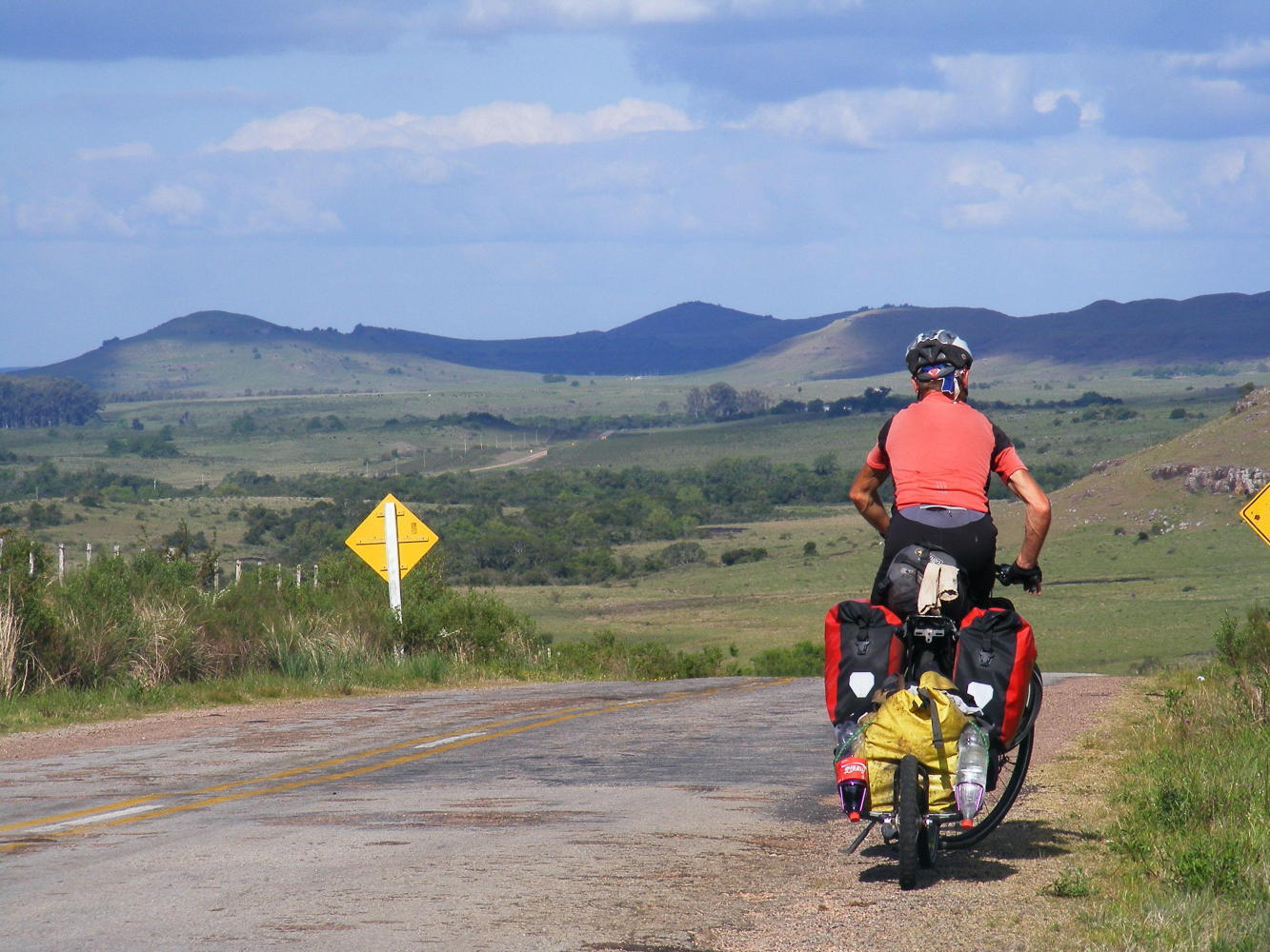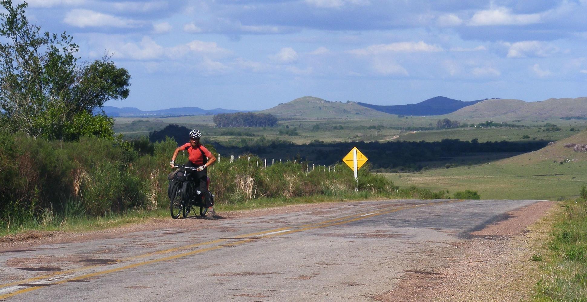 The road out of town was easy as it was well signed. My route was Department road 31 to Salto. It was already lunchtime but I couldn't stop as there were too many houses until 12km outside the city where I found a peaceful place for a picnic. The road onward was narrow having little traffic, quite rough and patchy in places, meandering past laneways to farmsteads before climbing up to rough pasture moorland with a view far and wide.