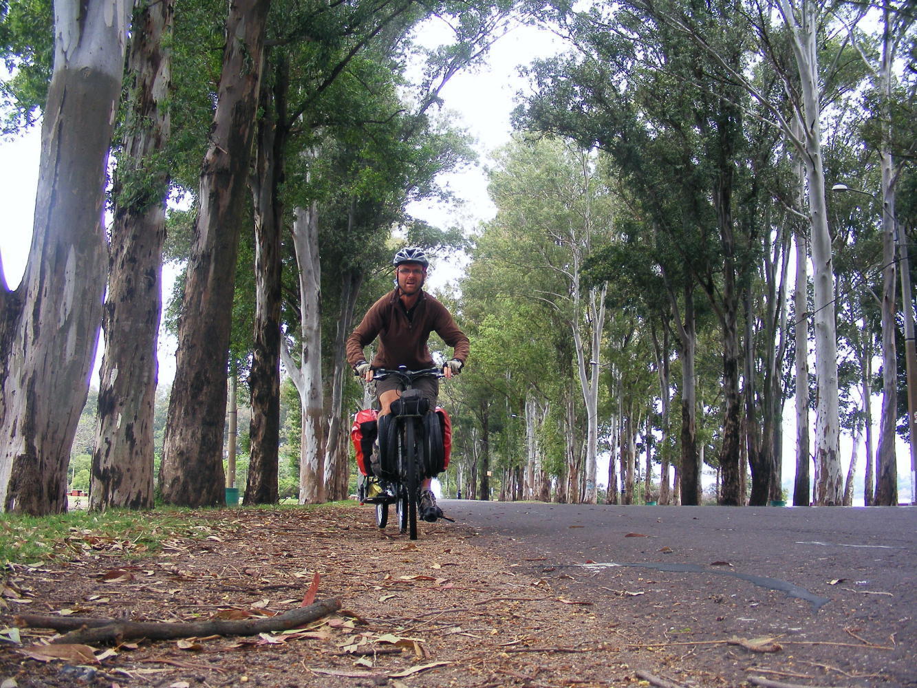 It was yet another grey morning as I cycled along the main shopping street down to the waterfront where I turned right onto a riverside road with a canopy of tall eucalyptus on either side. Except for the occational car there was next to no traffic on this road. It had a smooth paved surface but soon began to get narrow. I's hoping this would be a quiet cycle out of the city to route 3 northbound but it began to look doubtful whether it would continue mush further as soon the pavement finished and it became a bumpy brown dirt road. The worst that could happen would be to have to cycle back into Salto and cycle back out the rough heavy traffic road I'd cycled in on on Sunday.