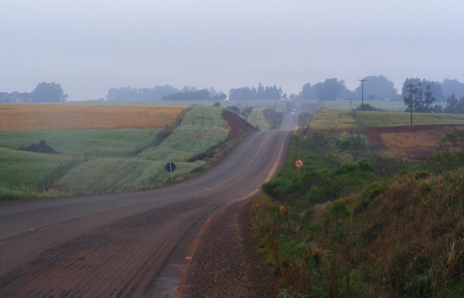 I reached another town at five where I stopped to buy bread and Dulce de Leche. Thereafter it was heavy evening rush hour traffic with many vans and light trucks speeding past which was concernable as there wasn't a shoulder. Gladly though, it was only 9km more to the main road with a shoulder on the edge of a city. I didn't have to enter the city though as the road BR285 past it by. Soon I turned off on to BS155 my planned route North which past the Eastern margin of the city and because of the closeness of the city it was hard finding a place to camp as it was villas, garden centres and such businesses for a long way until I found a short lane-way up through a corps of trees to a field of wheat where I camped on the grassy side of the gateway well out of view.