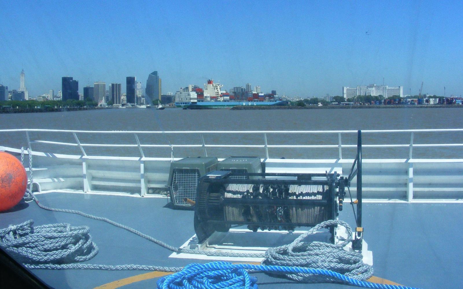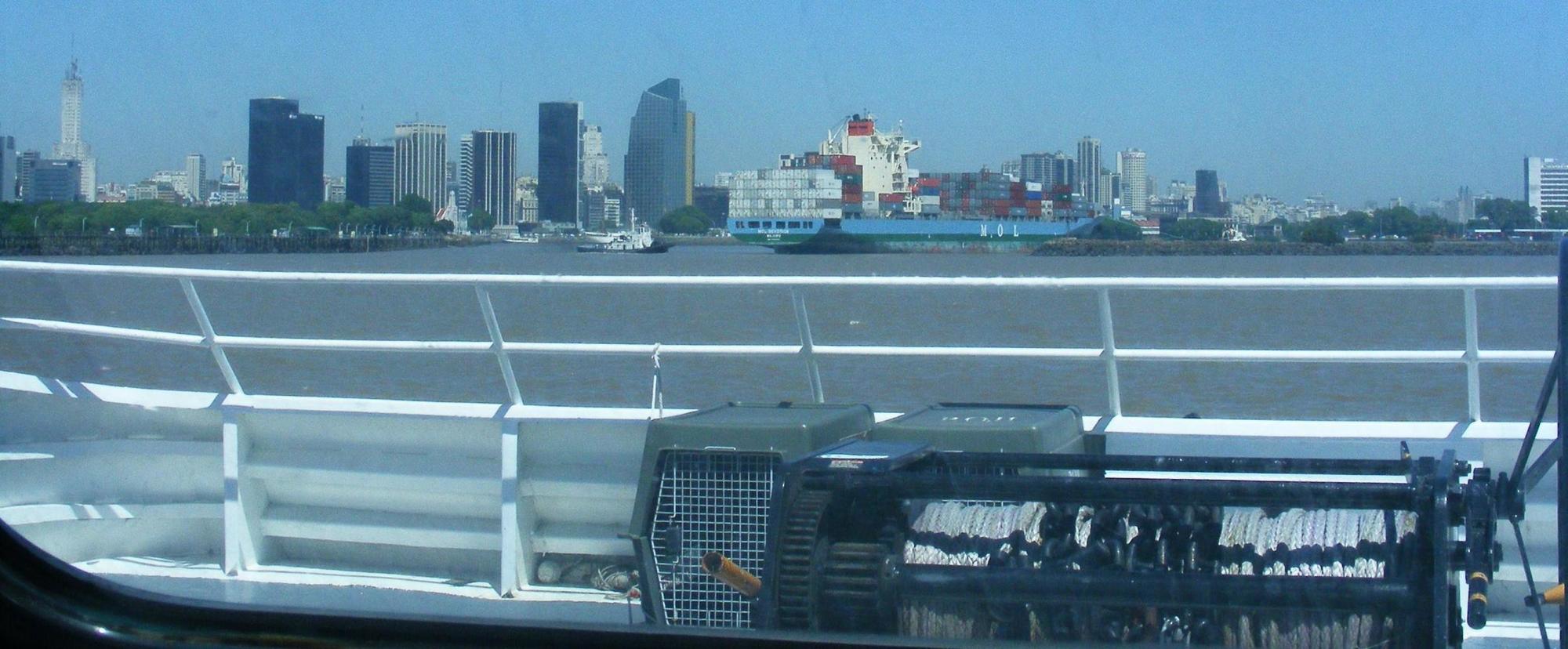 As I write the craft is still vibrating now 15 minutes after leaving port. Uruguay is now a thin line on the horizon behind. Looking out the sides, the brown sea that is the River Plate gently rises and falls. Ahead there is no sign of land but I reckon on seeing Buenos Aires within an hour. Ah, remember Argentina is an hour behind so I'll synchronize my watch now before I forget.