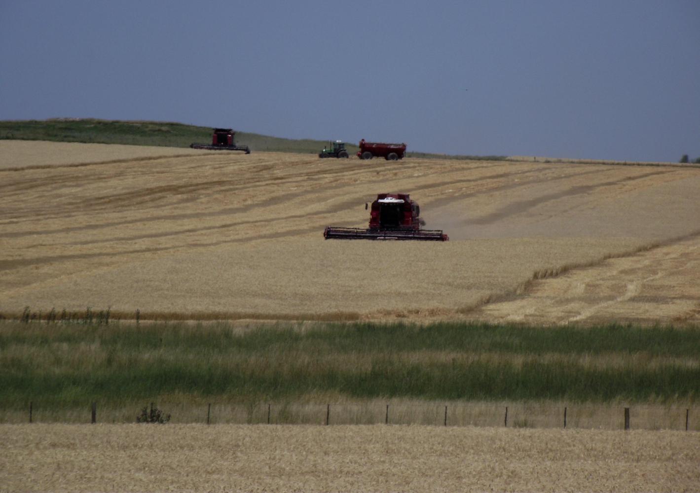 Onwards, the roller-coaster continued. There were verdant green plots of not yet in bloom Sunflowers but the dominant colour was gold, wheat everywhere and dust rising from busy combine harvesters.