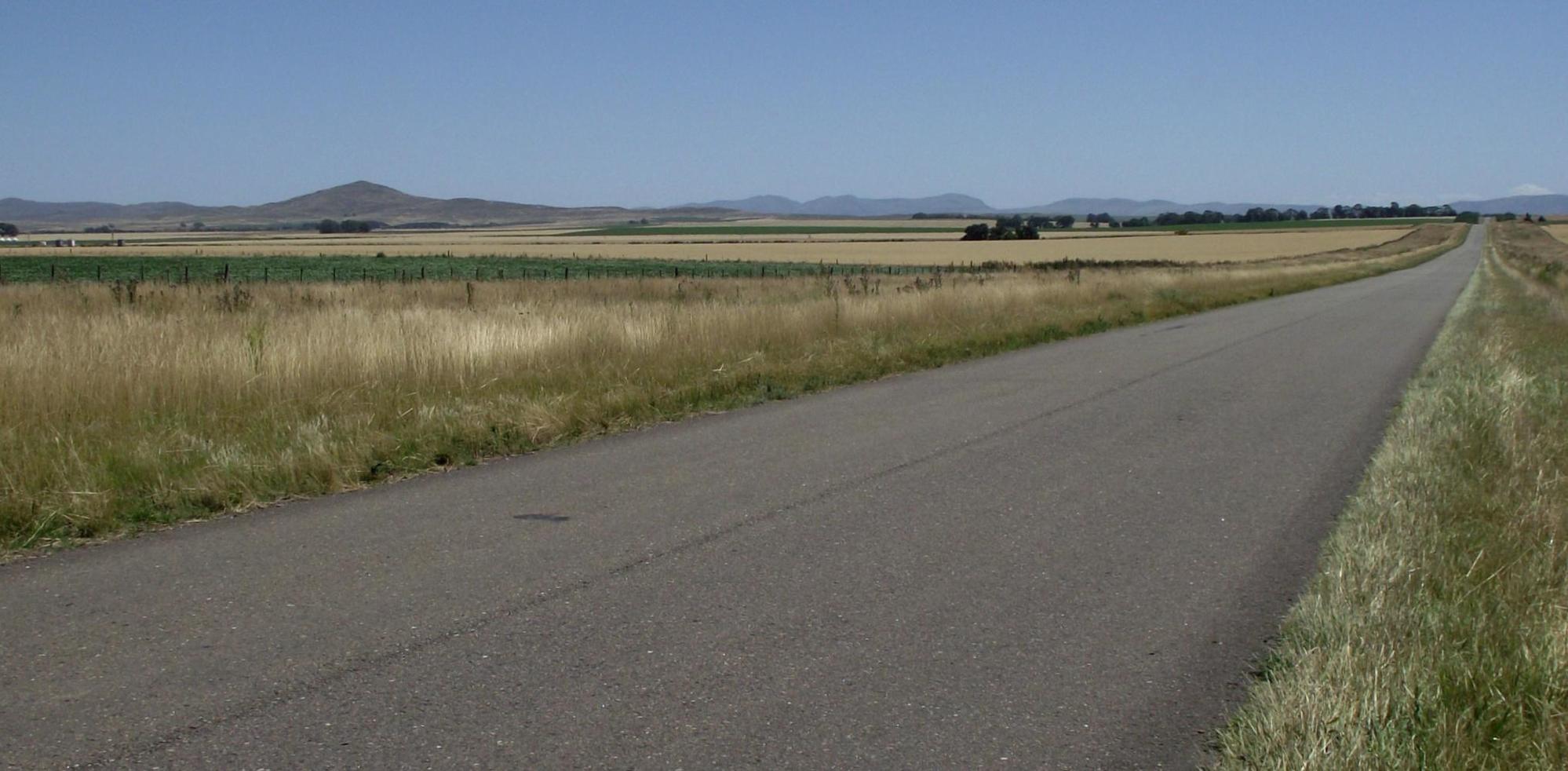 And better it would get the farther I the cyclist rode. The road became a gentle roller-coaster, up and over, down and gradually up to the next summit. Wheat-fields on either side had low round hills in them. And off ahead I see the outline of mountains.