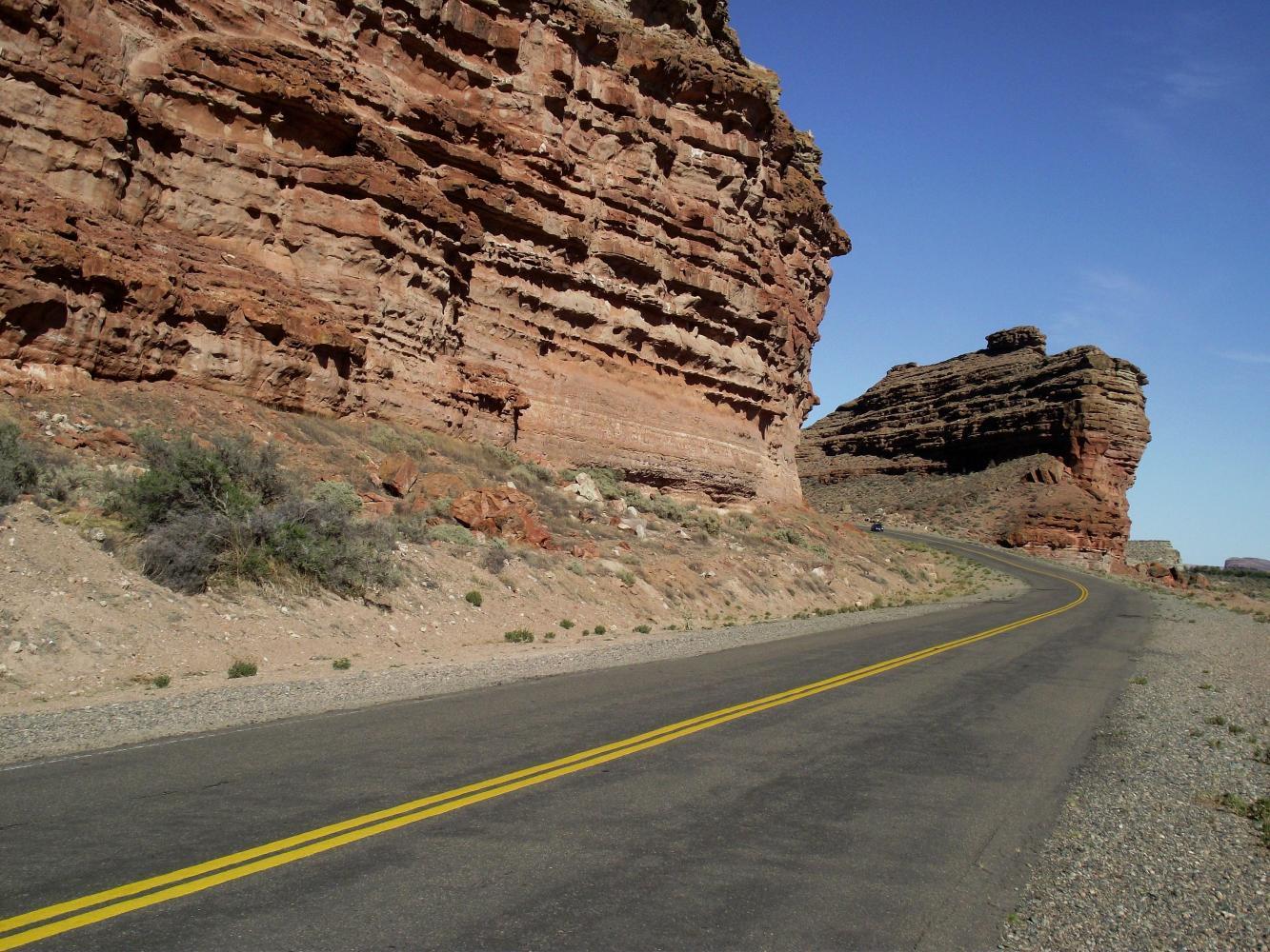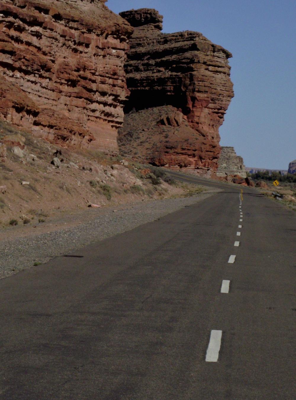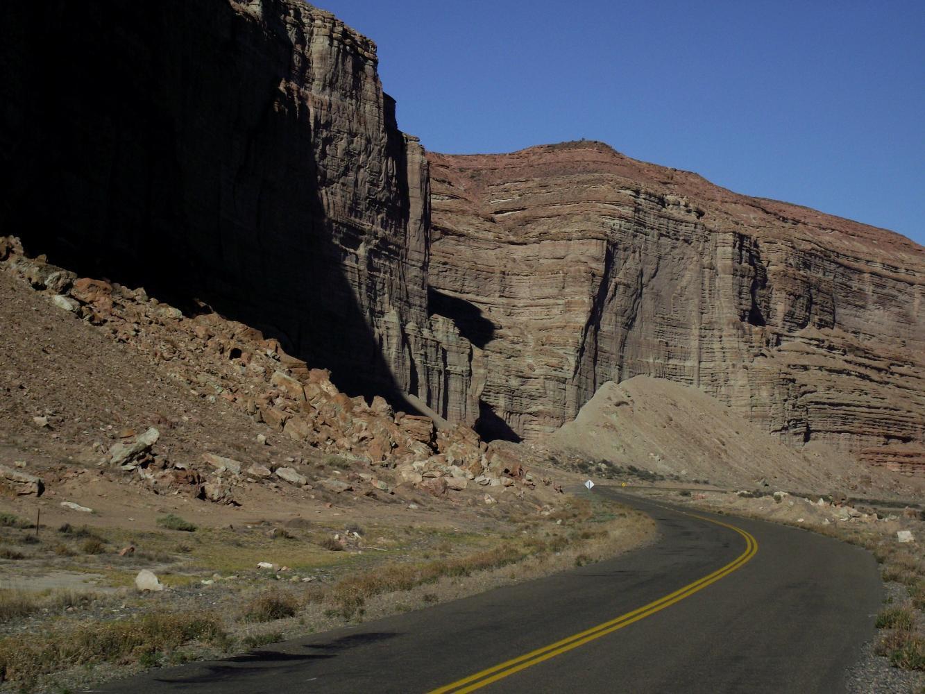 The sky was cloudless and there was a cold nip in the air while cycling away from the village through the valley of the Altars. Shortly, I stop to marvel and take photos where the road follows the base of impressive cliffs which look as if architecturally thought-out and carefully sculptured by some unknown beings. There's a curved concave hollow in the corner where the cliff turns right and so the road most follow. A bit farther at another corner, the builder which I suspect is Messrs Wind, has left a gap up through the rock big enough to take the road leaving a strange bit of lone-standing cliff leaning as if it may tip over on it's side. This I believe is called "The Ship" as it looks some what ship-like.