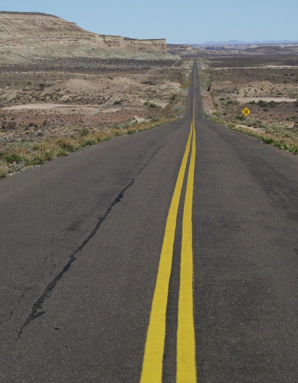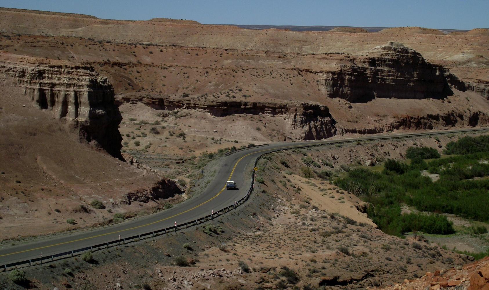 Up pass the ship the road goes, as though up through a passage, over a summit and then it's a long stretch across open dry scrub with the green willow riverbank off to the right. There are some rock formations on the left but they're a little bit from the road.