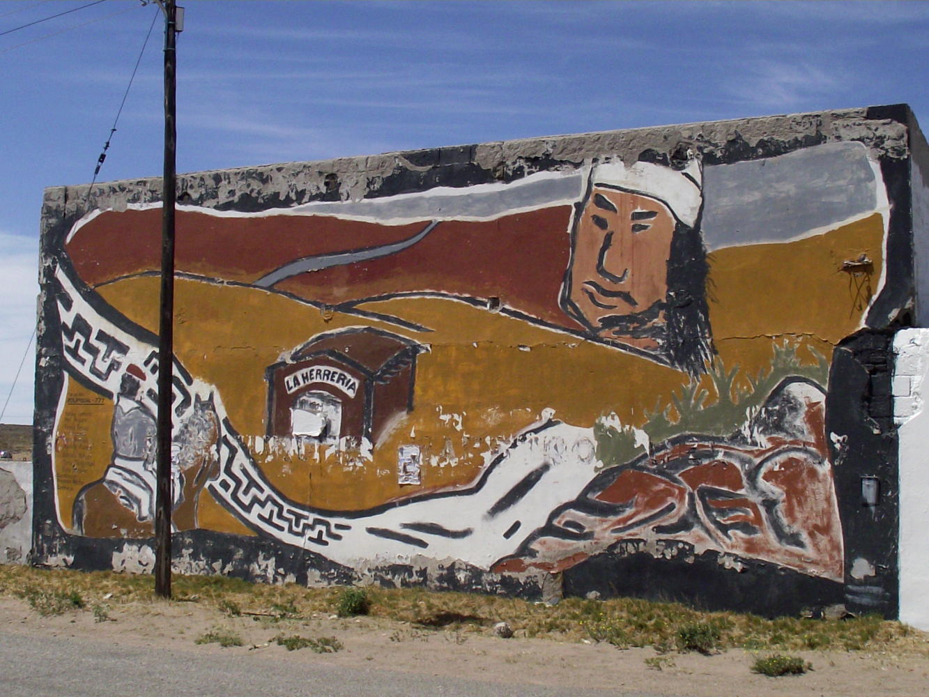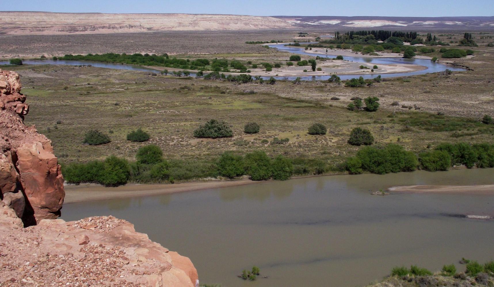Eventually, the road climbs a steep hill near the riverbank. At the top there's a path off to a summit with a cross on it and below it on the slope is inscribed in stones, Paso de Indios. Care most be taken up here as it's a shear drop to the plain below where the river meanders in a serious of big curves. This is the Paso de Indios alluded to. The native American people corralled their horses in the river bends as they forded the river here during the seasonal migration to the Andes for the warmer Summer months.