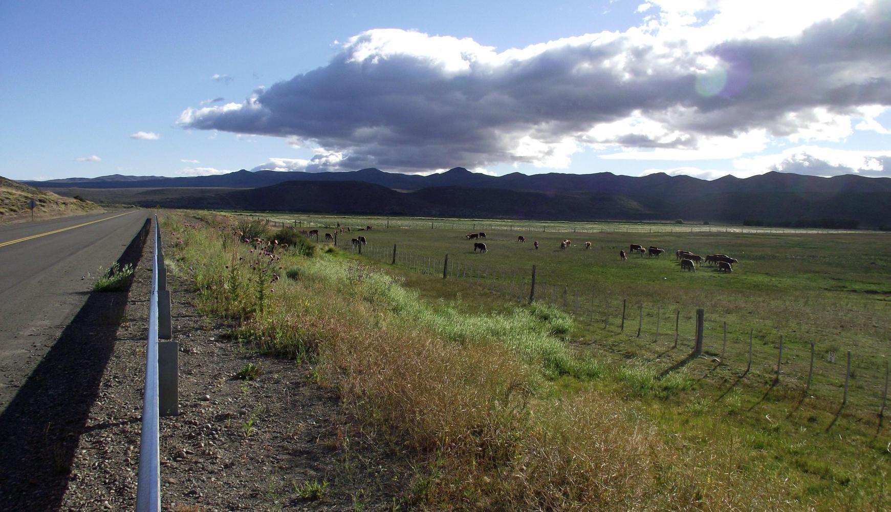 The countryside around-about Tecka is wild and windy, where the Patagonian wilderness dwarfs mans efforts at building. There's the rugged foothills of the Andes to the West and the mountainous plateau which I've crossed in the last two days to the East. In the middle is the lush meadow land along the Rio Tecka, where Pink Flamingos can be seen side by side with grazing Hereford cattle. The climate is cold, even in Summer it's a place to rap-up warmly. Typically heavy cloud moves in from the Andes and cold rain falls one minute, the next warm sunshine breaks through.
