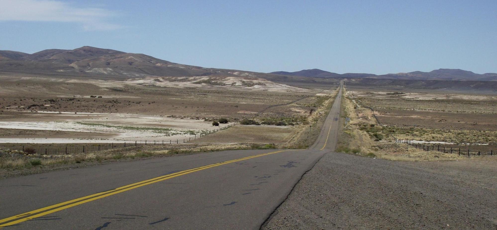 John was anxious to get going again as it was already very warm, while Nancy took some photos: the boys, argued as usual, in a good natured way about whom would watch what film in the evening. I left them as they paid for the drink. Today was mush of the same as yesterday; desert scrub with absolutely no shade to be found anywhere. The road climbed a gentle incline and then came a few kilometre decent to where could be seen a brief glimpse down into the valley of the meandering Rio Senguer with lines of popular trees dividing the pastureland on it's watered banks.