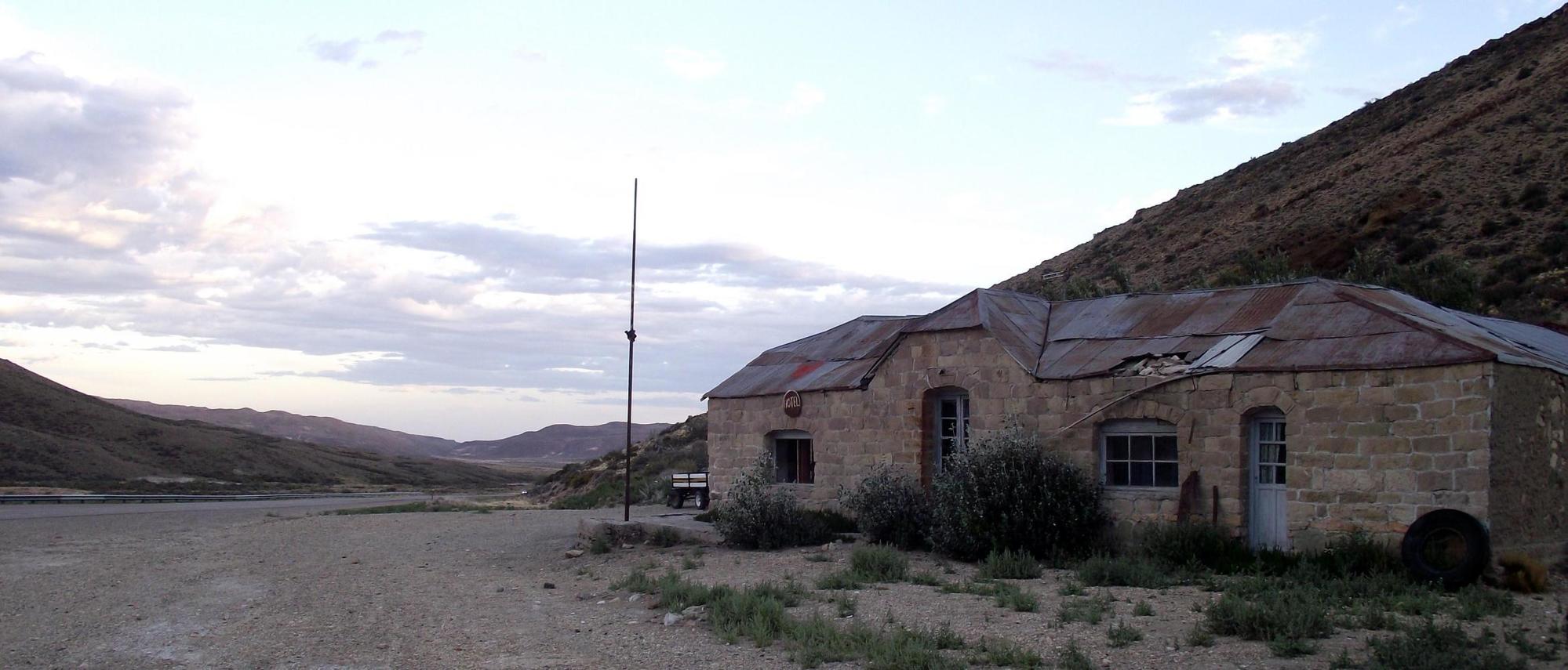 I reached Los Manantiales at 3.45, the house alluded to. It looked to be a derelict hotel, build with stone with a corrugated iron roof, the weeds grew-up by the front door and windows. I pushed the bike around the side where there was shade and found a side door open; and heard voices within. Painted on the house's side was, Comidor, Cerveza, so I expected refreshment inside. I entered. The voices now fell silence. It was like walking back in time into the 1970s. A long counter occupied one side with bottles on shelves behind which by appearance had been there a long time. All was cobwebbed and the paint was flaky and ancient. At one of the tables which made up the barroom a guacho with gray hair and weather worn face sat mute. And the woman of the establishment that previously to me entering held a conversation with him, sat by the counter. After drinking a small can of beer which was double the normal price I asked could I camp outside. Yes was the reply.