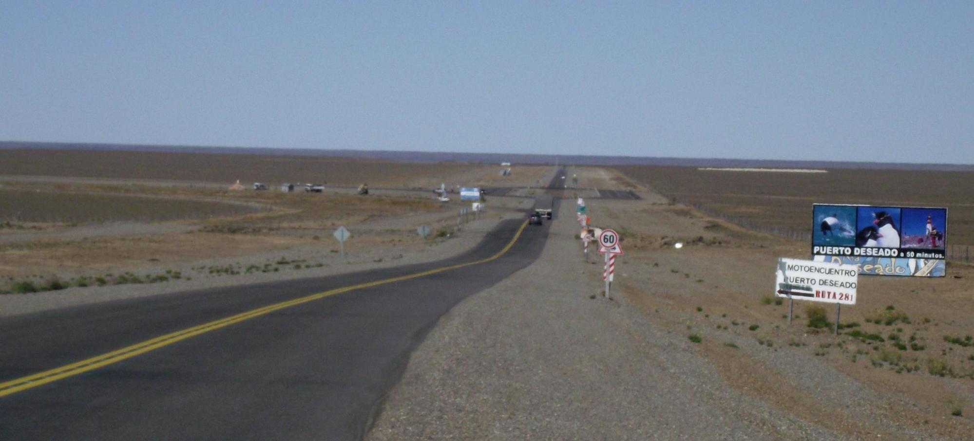 I pass through the turn-off for Puerto Deseado and see on the left the clump of trees which is the village of Jaramilo which on the sign is 7km away but only looks as though a few hundred metres away. Shortly the road descends down into a great wide canyon with orange barrancas and a sandy dry river through it's middle: the valley of the Deseado river; followed by a long climb out the other side.