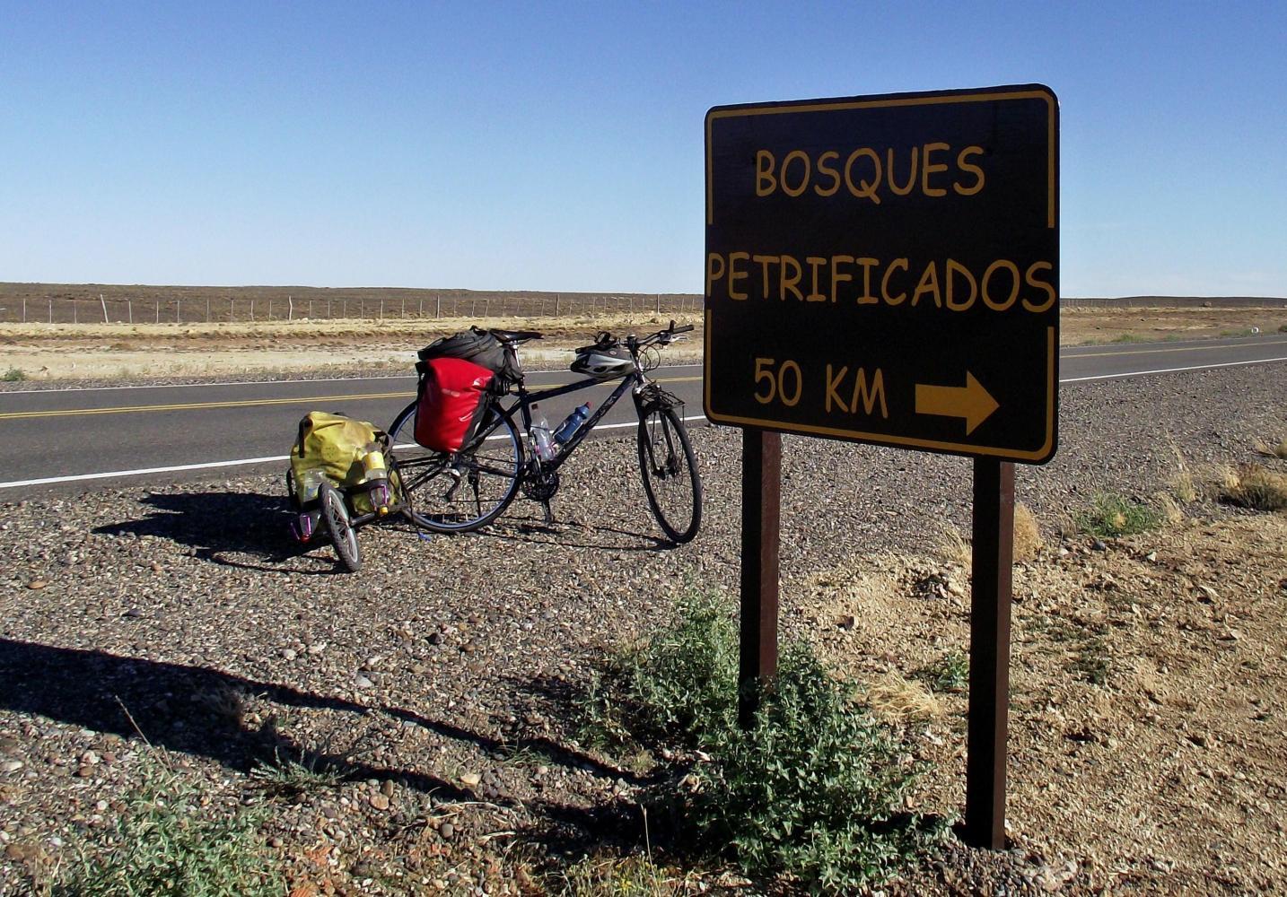 Shortly; I stop at a turn-off for the Petrified Forest Natural Monument: it is 50km of stones and dust every time a vehicle passes. Sat with the trailer as a back-rest I lean my head against the pannier and doze off; and hear a familiar voice call my name. I awoke with a start and discover no one there: all is silent except for the distant whinging sound of an approaching truck.