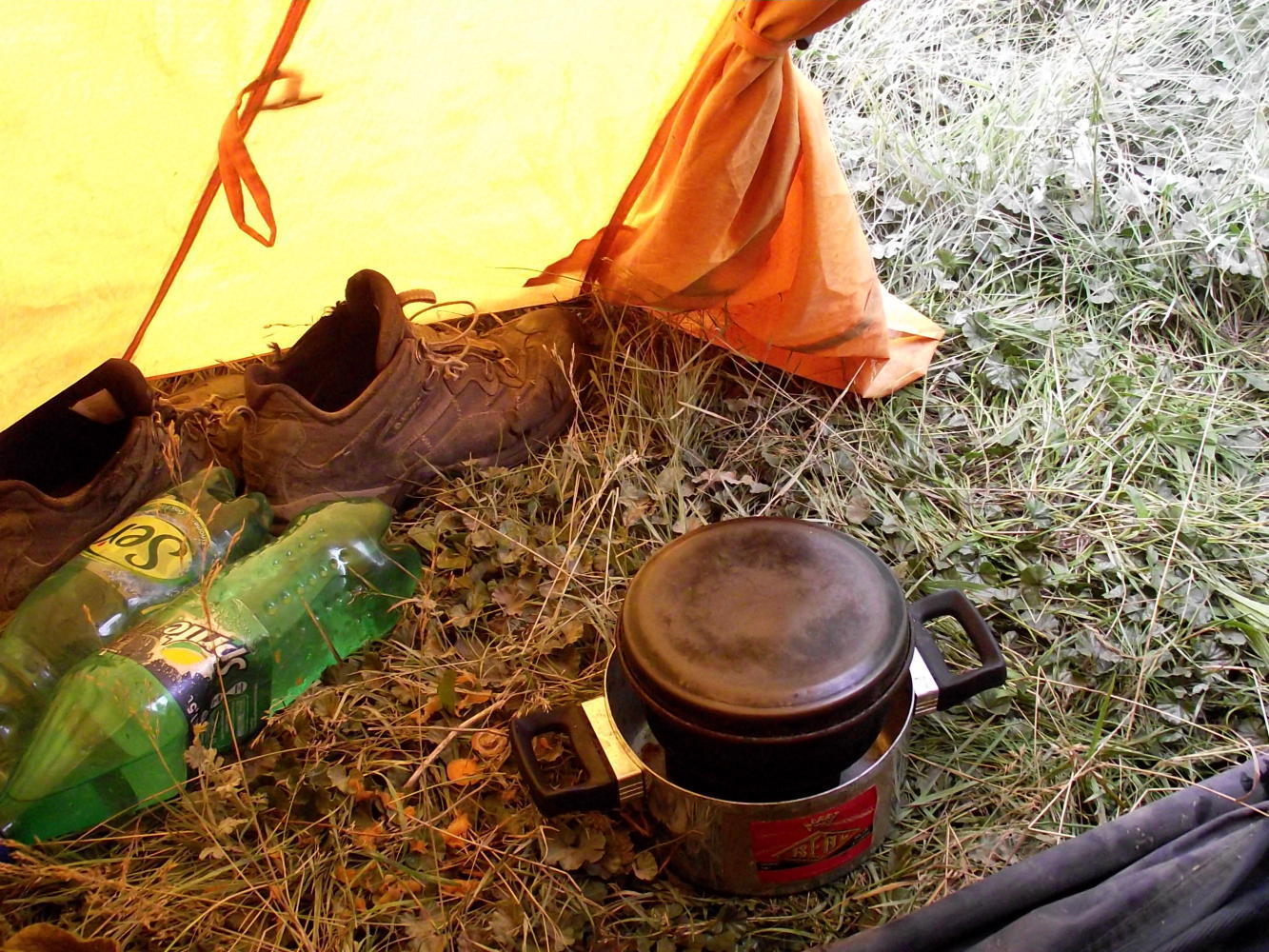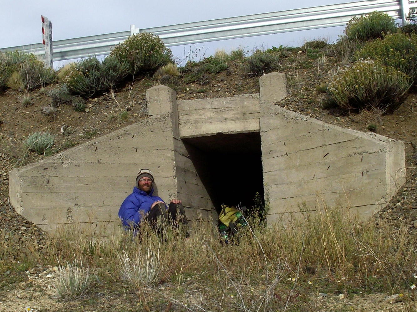 After 10km, the road leaves the valley in one long straight rise up to the rolling plateau again: it isn't far then until the road passes over an embankment with a channel underneath. Now as I write, I sit at the mouth of the said channel; it is a square concrete tunnel which I've pushed the bike into for the night; and I swept out the small stones with my shoe to clear a place for the mat and sleeping-bag. The wind has increased and I didn't want to risk the tent.
